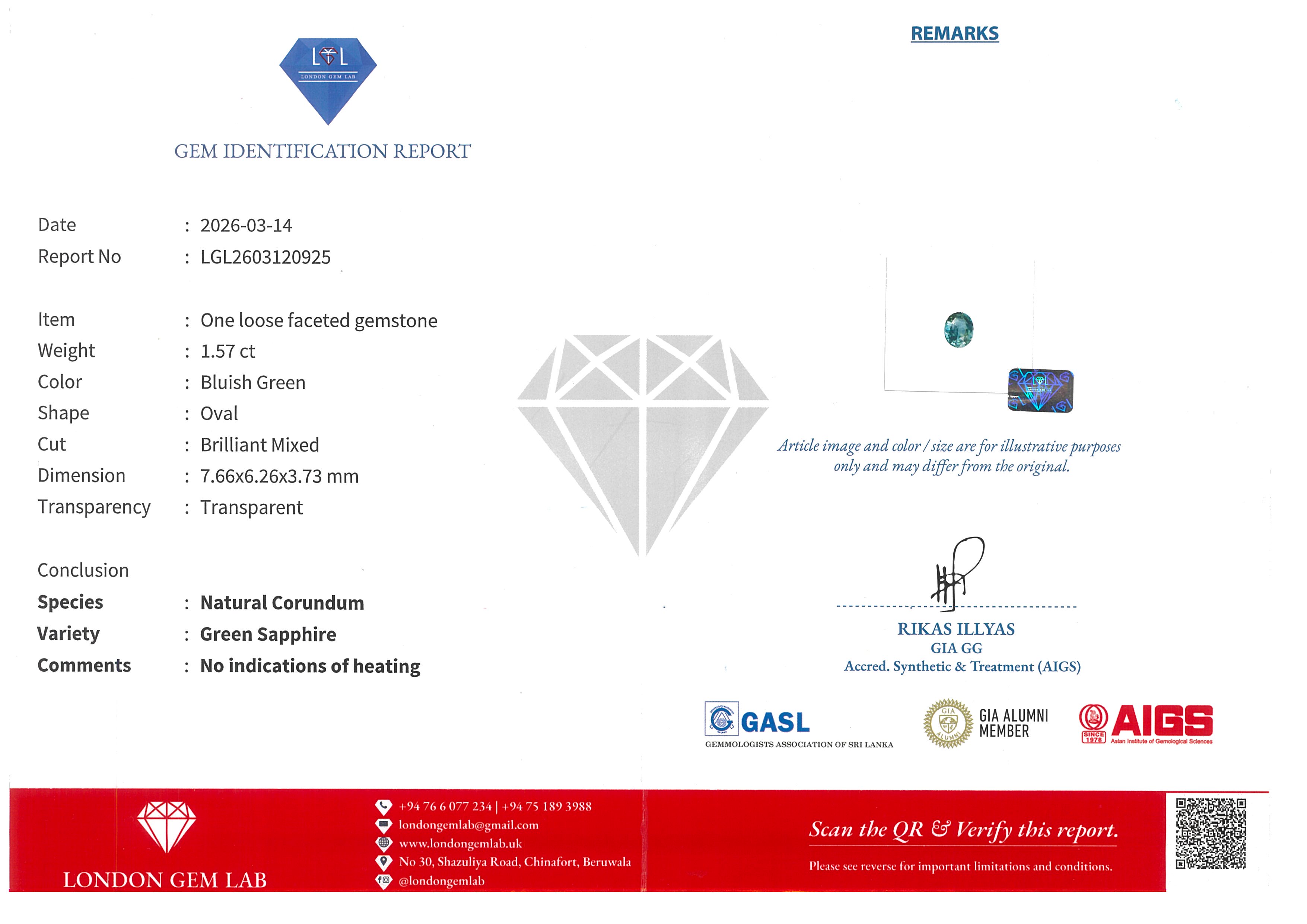 LGL: LGL2603120925 Stock ID: MSV2603321.56ct Teal Oval Madagascar SapphireCarat: 1.56 ctType: SapphireCut: OvalColour: TealOrigin: MadagascarComment: Not Heated7.66 x 6.26 x 3.73 mm