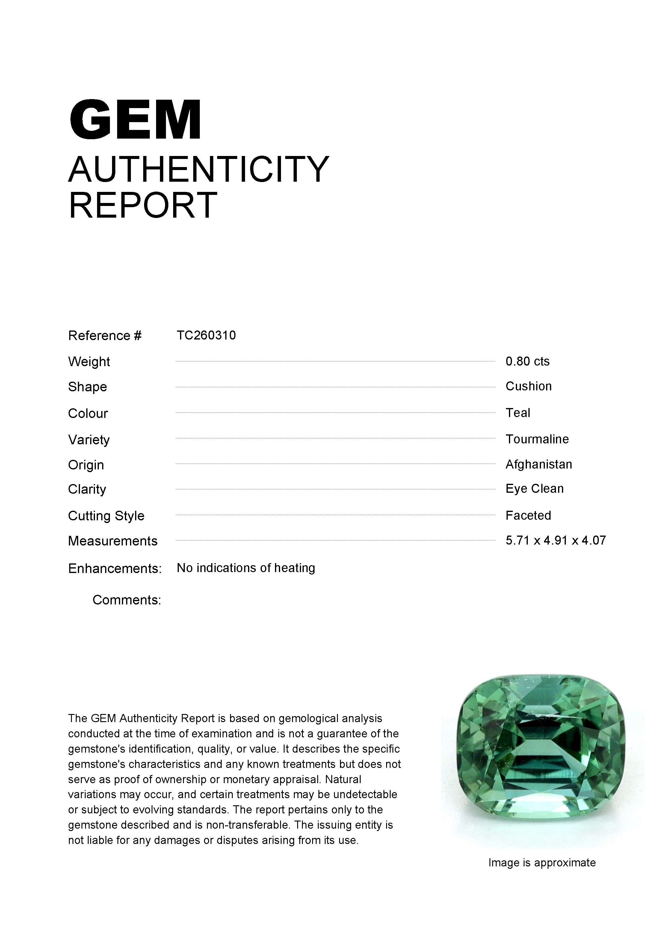 0.80ct Teal Cushion Afghanistan TourmalineCarat: 0.80 ctType: TourmalineCut: CushionColour: TealOrigin: AfghanistanComment: Not Heated5.71 x 4.91 x 4.07 mm