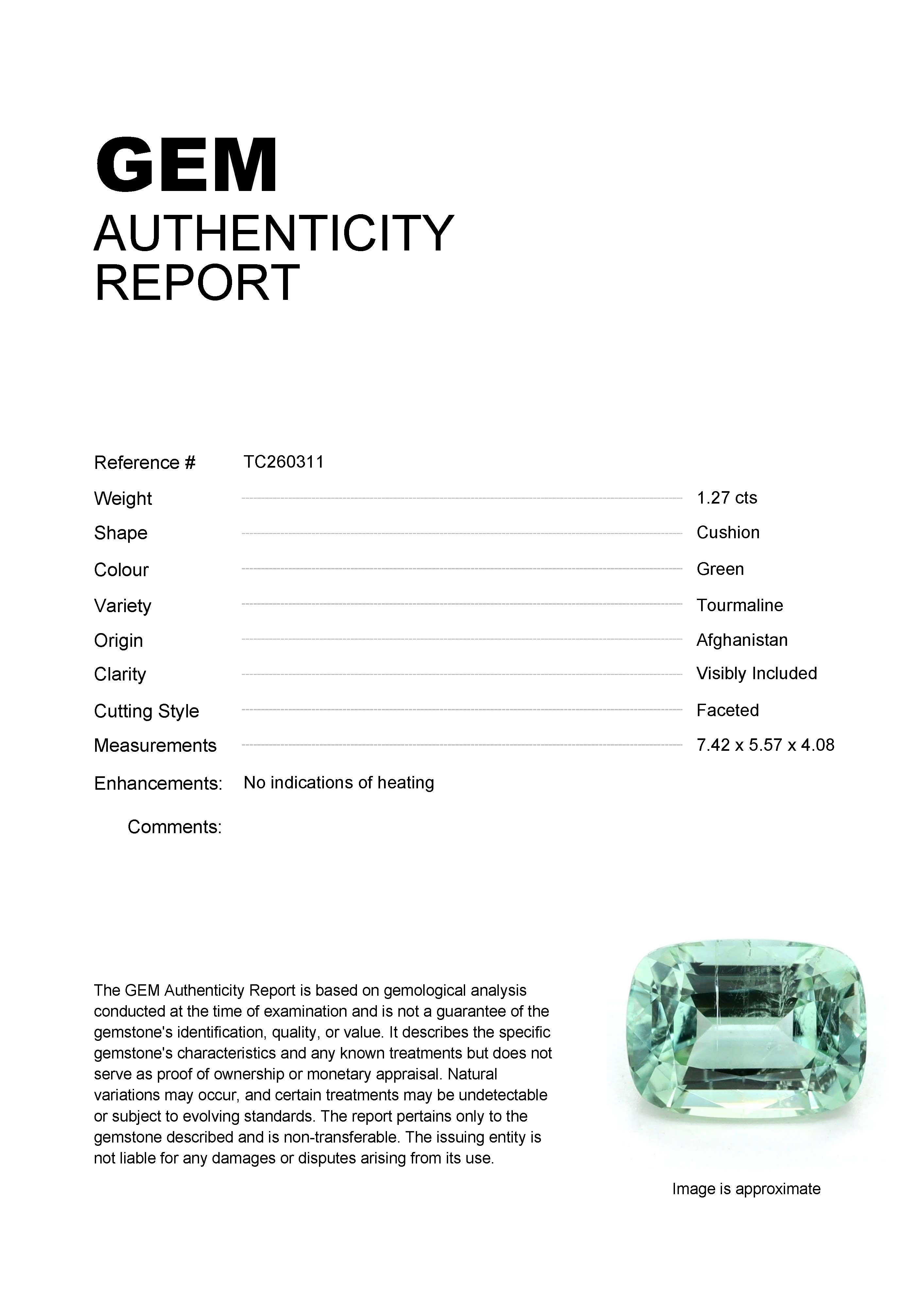 1.27ct Green Cushion Afghanistan TourmalineCarat: 1.27 ctType: TourmalineCut: CushionColour: GreenOrigin: AfghanistanComment: Not Heated7.42 x 5.57 x 4.08 mm