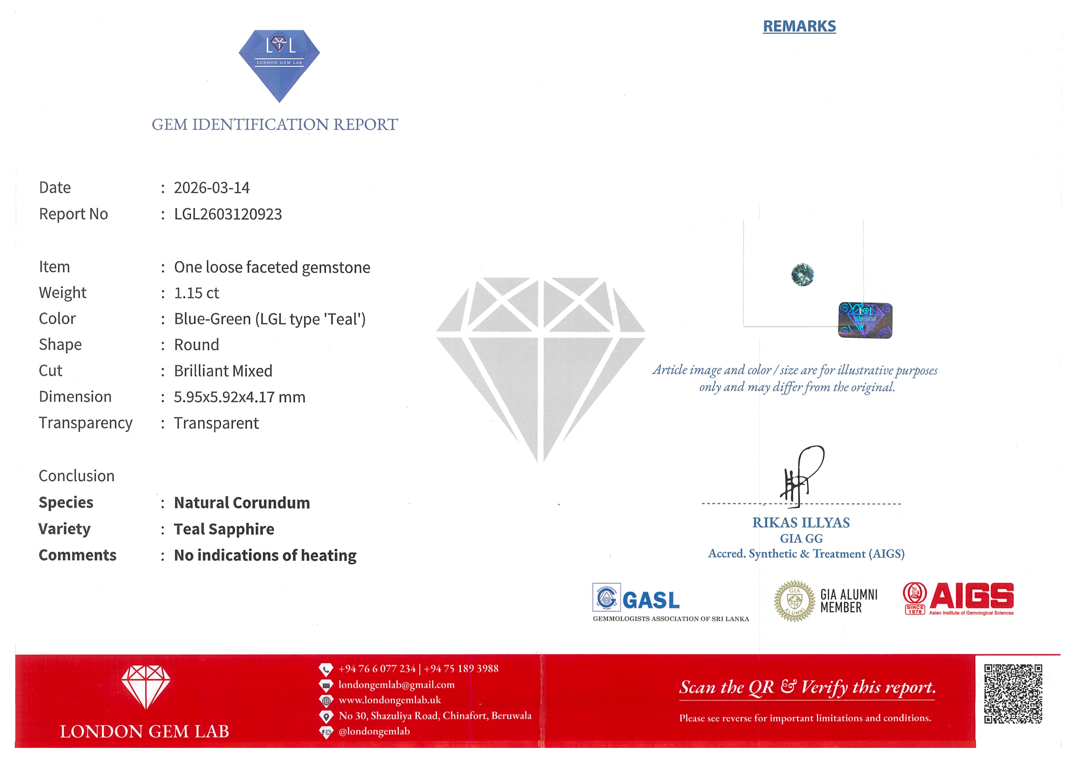 LGL: LGL2603120982 Stock ID: MSR2603201.05ct Teal Round Madagascar SapphireCarat: 1.05 ctType: SapphireCut: RoundColour: TealOrigin: MadagascarComment: Not Heated5.53 x 5.51 x 4.32 mm