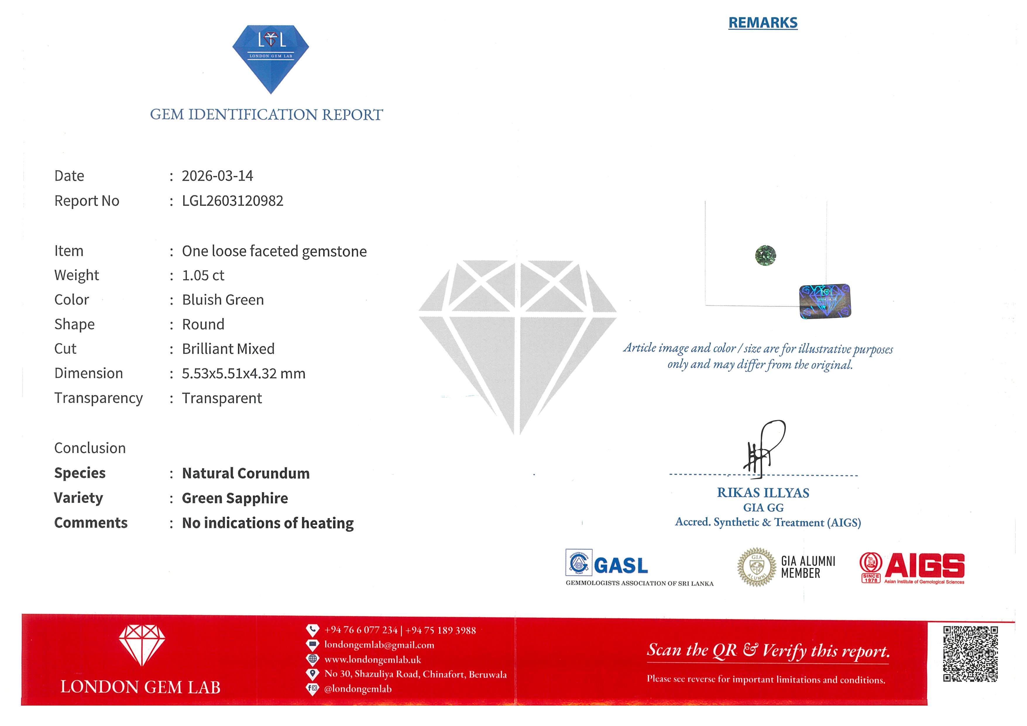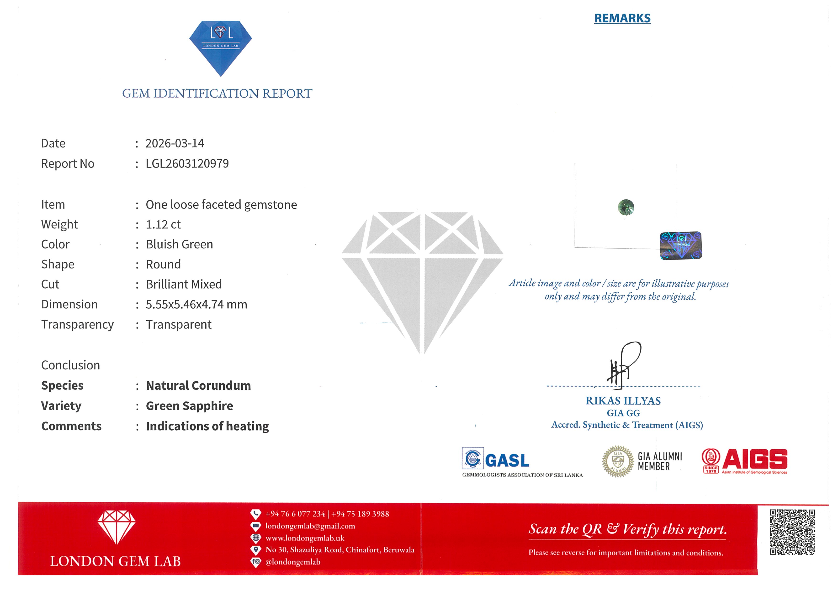 LGL: LGL2603120979 Stock ID: MSR2603211.12ct Green Round Madagascar SapphireCarat: 1.12 ctType: SapphireCut: RoundColour: GreenOrigin: MadagascarComment: Heated5.55 x 5.46 x 4.74 mm