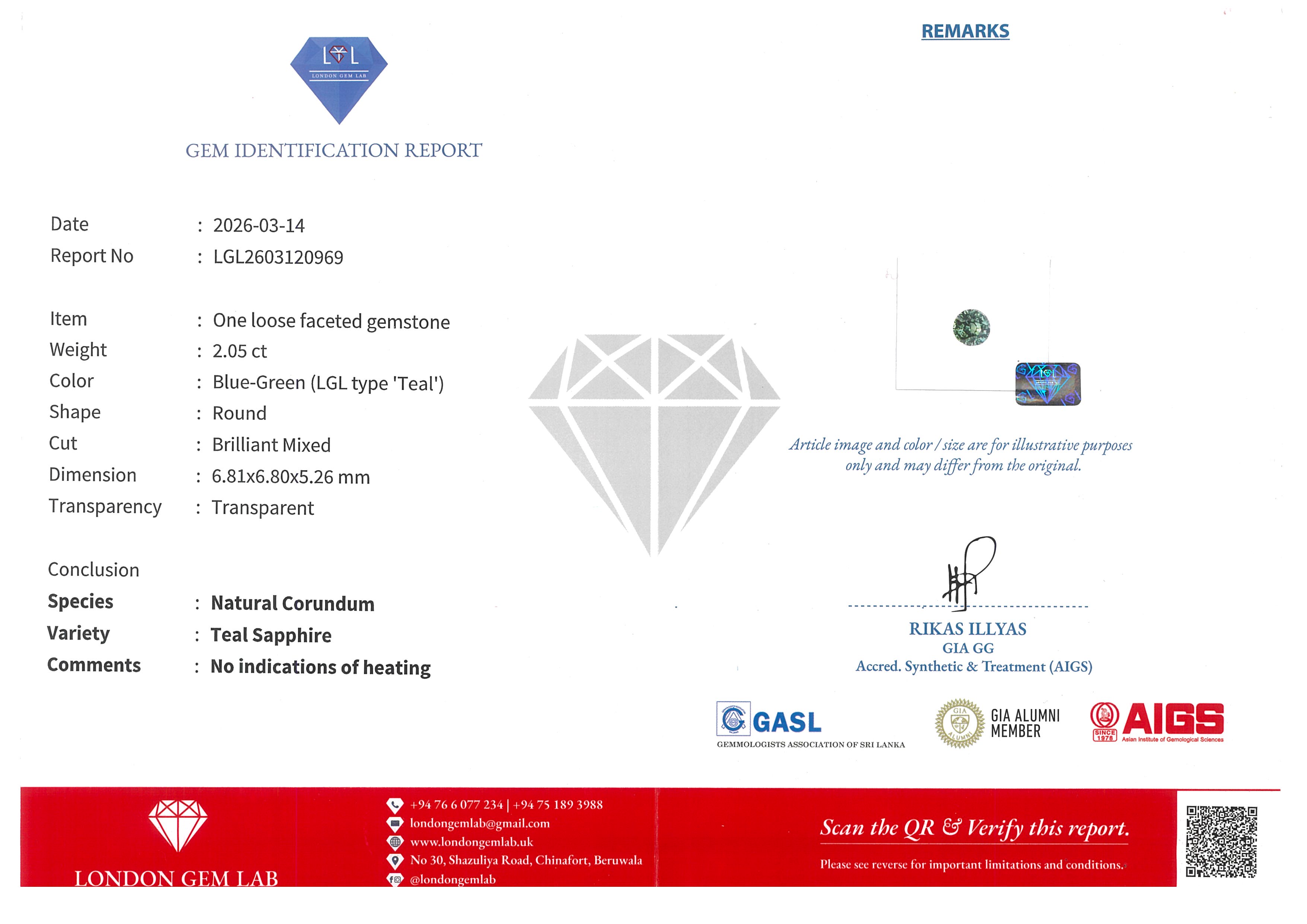 LGL: LGL2603120969 Stock ID: MSR2603142.05ct Teal Round Madagascar SapphireCarat: 2.05 ctType: SapphireCut: RoundColour: TealOrigin: MadagascarComment: Not Heated6.81 x 6.80 x 5.26 mm