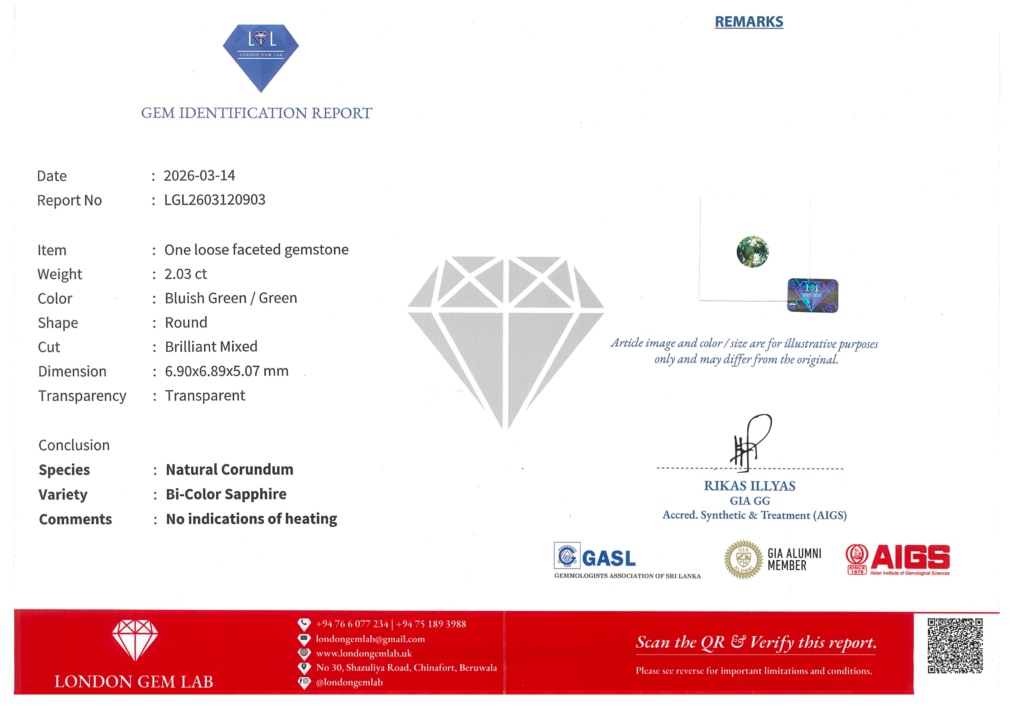 LGL: LGL2603120903 Stock ID: MSR2603182.03ct Parti Round Madagascar SapphireCarat: 2.03 ctType: SapphireCut: RoundColour: PartiOrigin: MadagascarComment: Not Heated6.90 x 6.89 x 5.07 mm