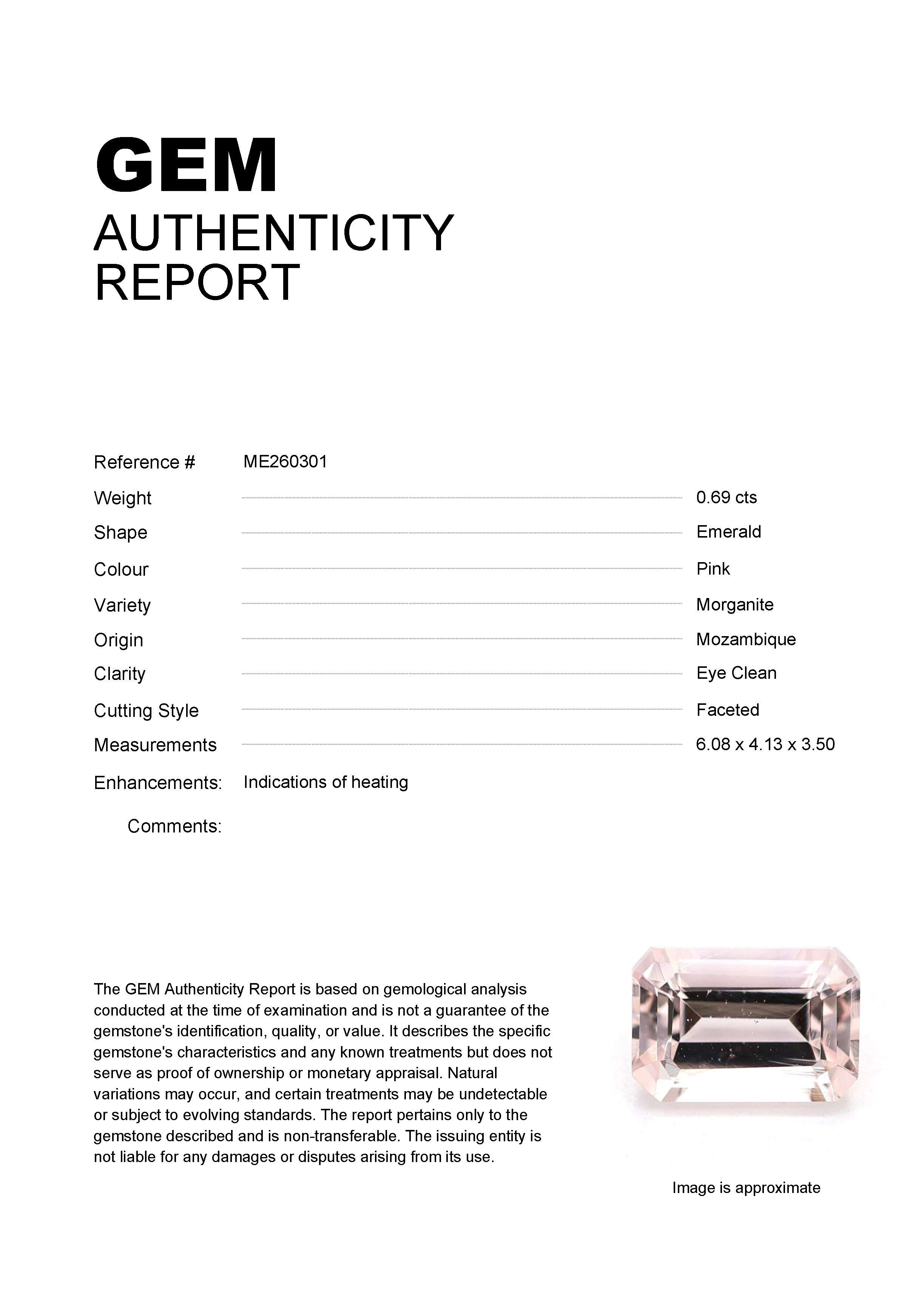 0.71ct Pink Emerald Mozambique MorganiteCarat: 0.71 ctType: MorganiteCut: EmeraldColour: PinkOrigin: MozambiqueComment: Heated6.11 x 4.13 x 3.57 mm