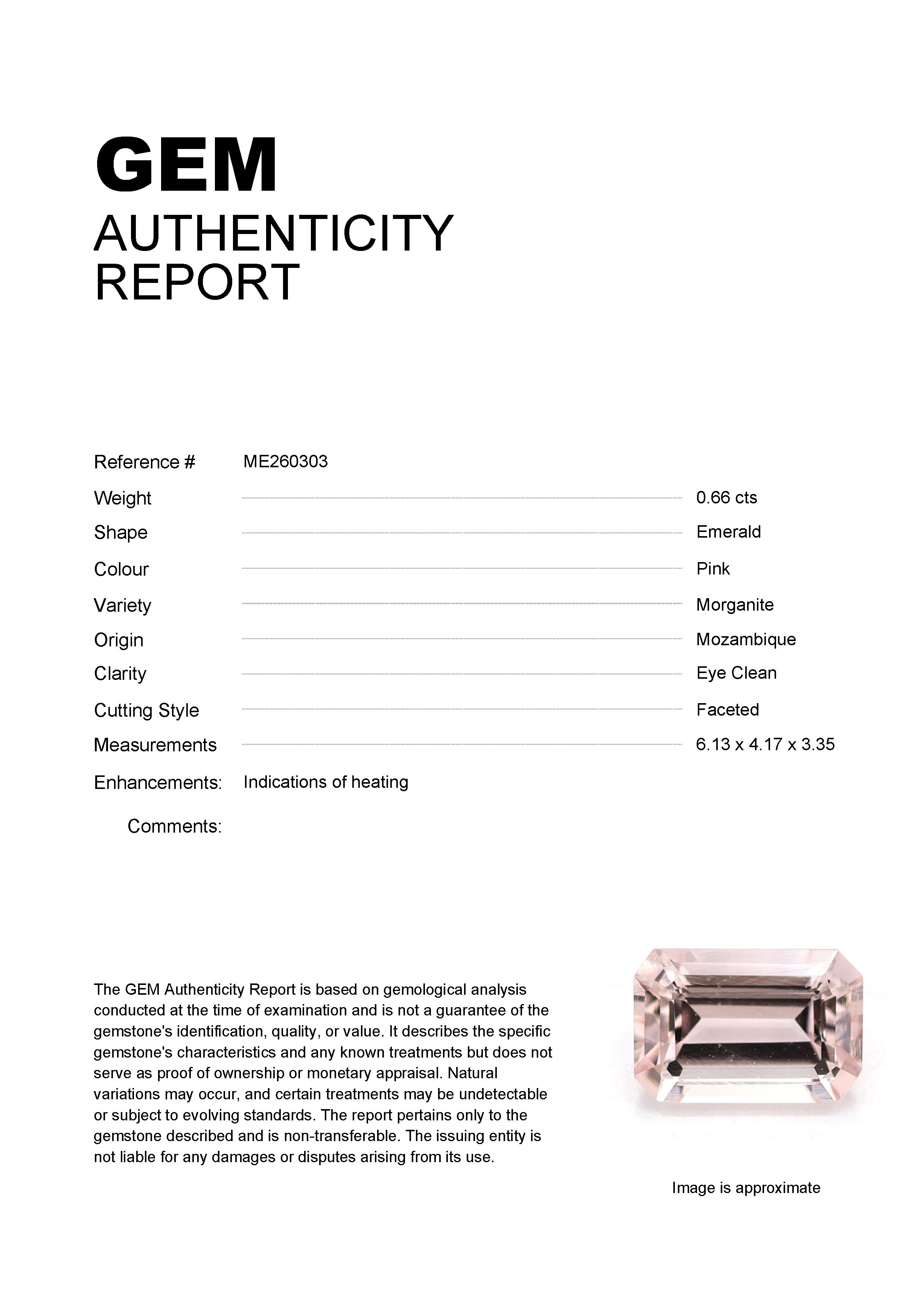 0.66ct Pink Emerald Mozambique MorganiteCarat: 0.66 ctType: MorganiteCut: EmeraldColour: PinkOrigin: MozambiqueComment: Heated6.13 x 4.17 x 3.35 mm