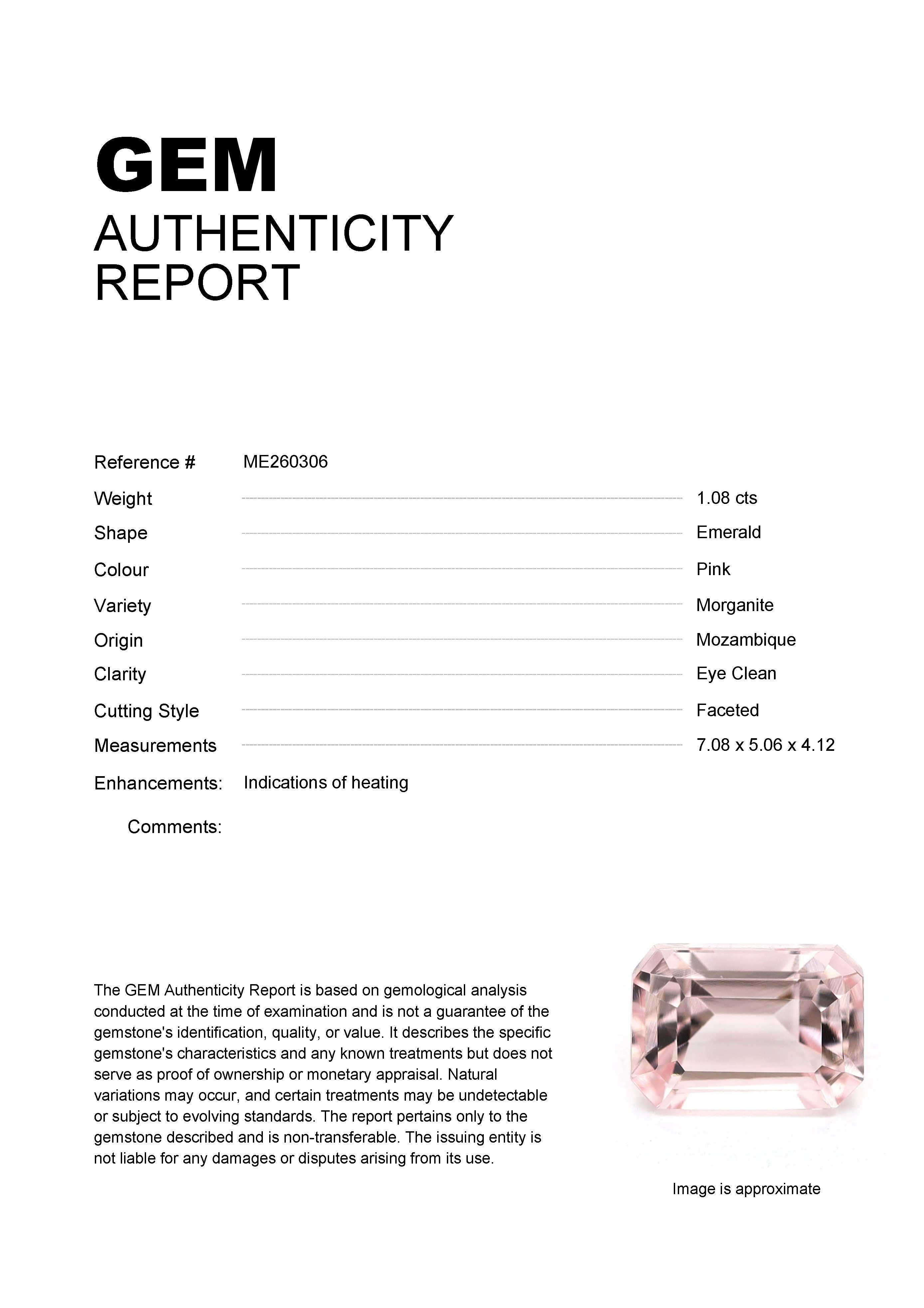 1.08ct Pink Emerald Mozambique MorganiteCarat: 1.08 ctType: MorganiteCut: EmeraldColour: PinkOrigin: MozambiqueComment: Heated7.08 x 5.06 x 4.12 mm