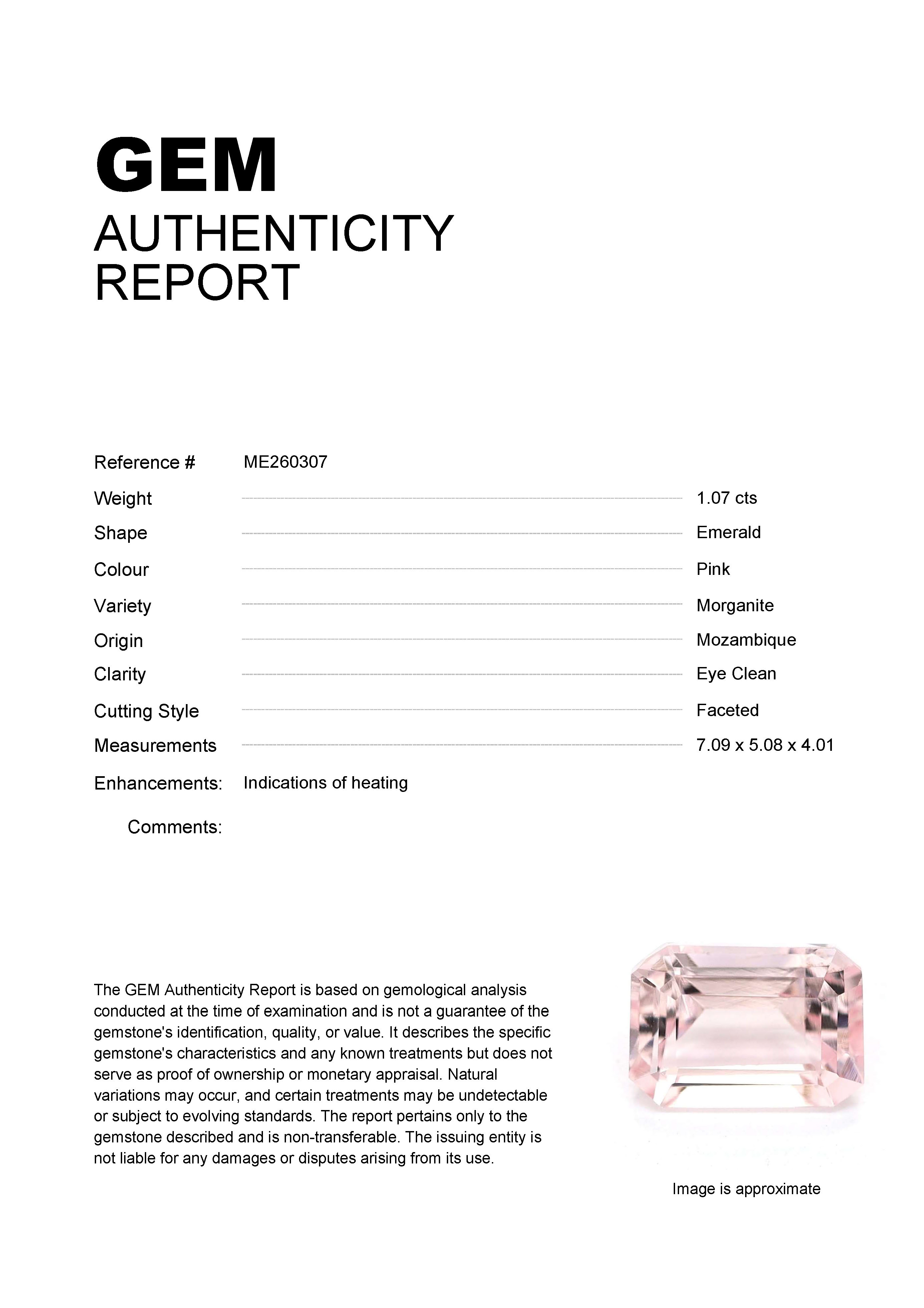 1.07ct Pink Emerald Mozambique MorganiteCarat: 1.07 ctType: MorganiteCut: EmeraldColour: PinkOrigin: MozambiqueComment: Heated7.09 x 5.08 x 4.01 mm
