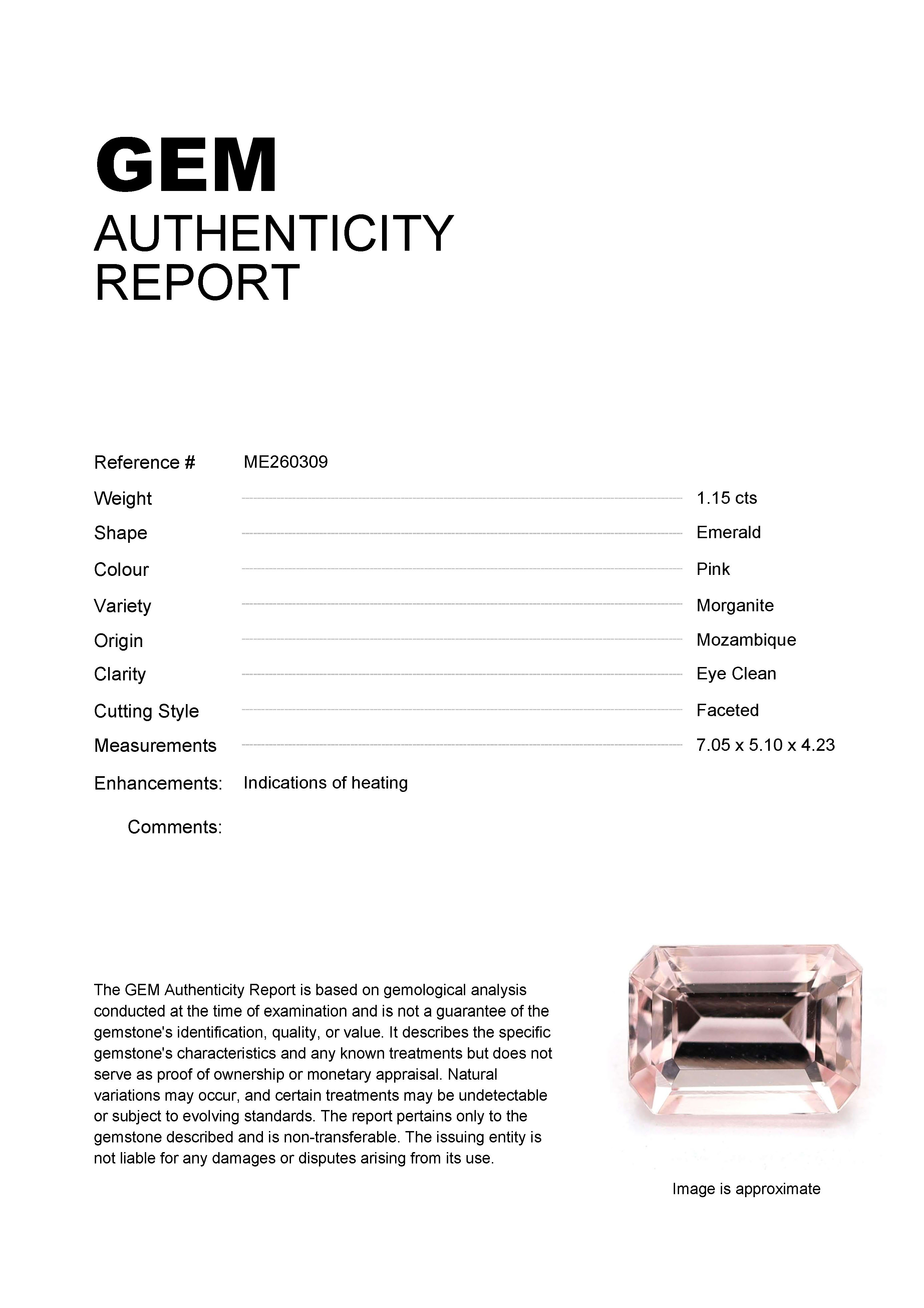 1.15ct Pink Emerald Mozambique MorganiteCarat: 1.15 ctType: MorganiteCut: EmeraldColour: PinkOrigin: MozambiqueComment: Heated7.05 x 5.10 x 4.23 mm