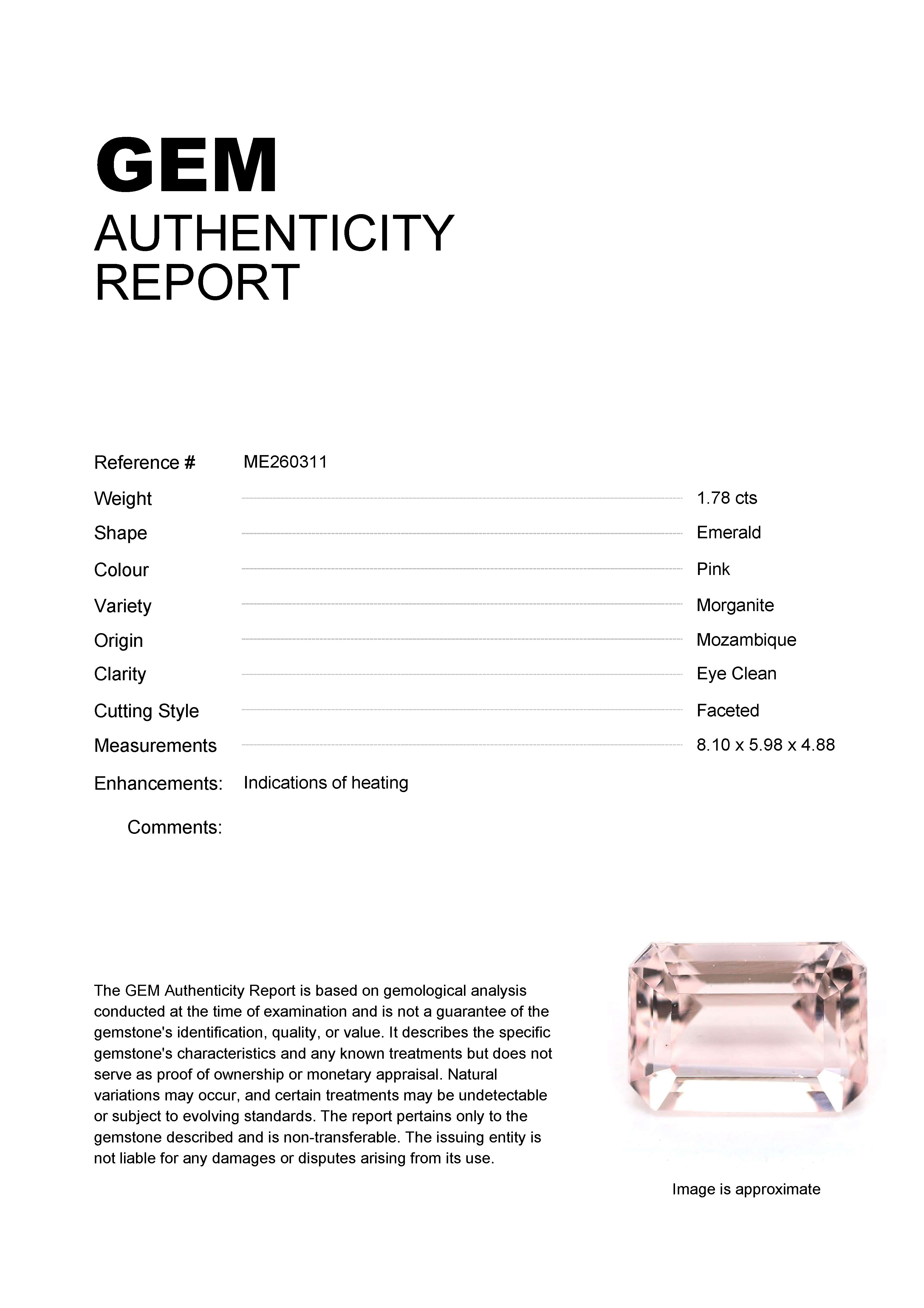 1.78ct Pink Emerald Mozambique MorganiteCarat: 1.78 ctType: MorganiteCut: EmeraldColour: PinkOrigin: MozambiqueComment: Heated8.10 x 5.98 x 4.88 mm