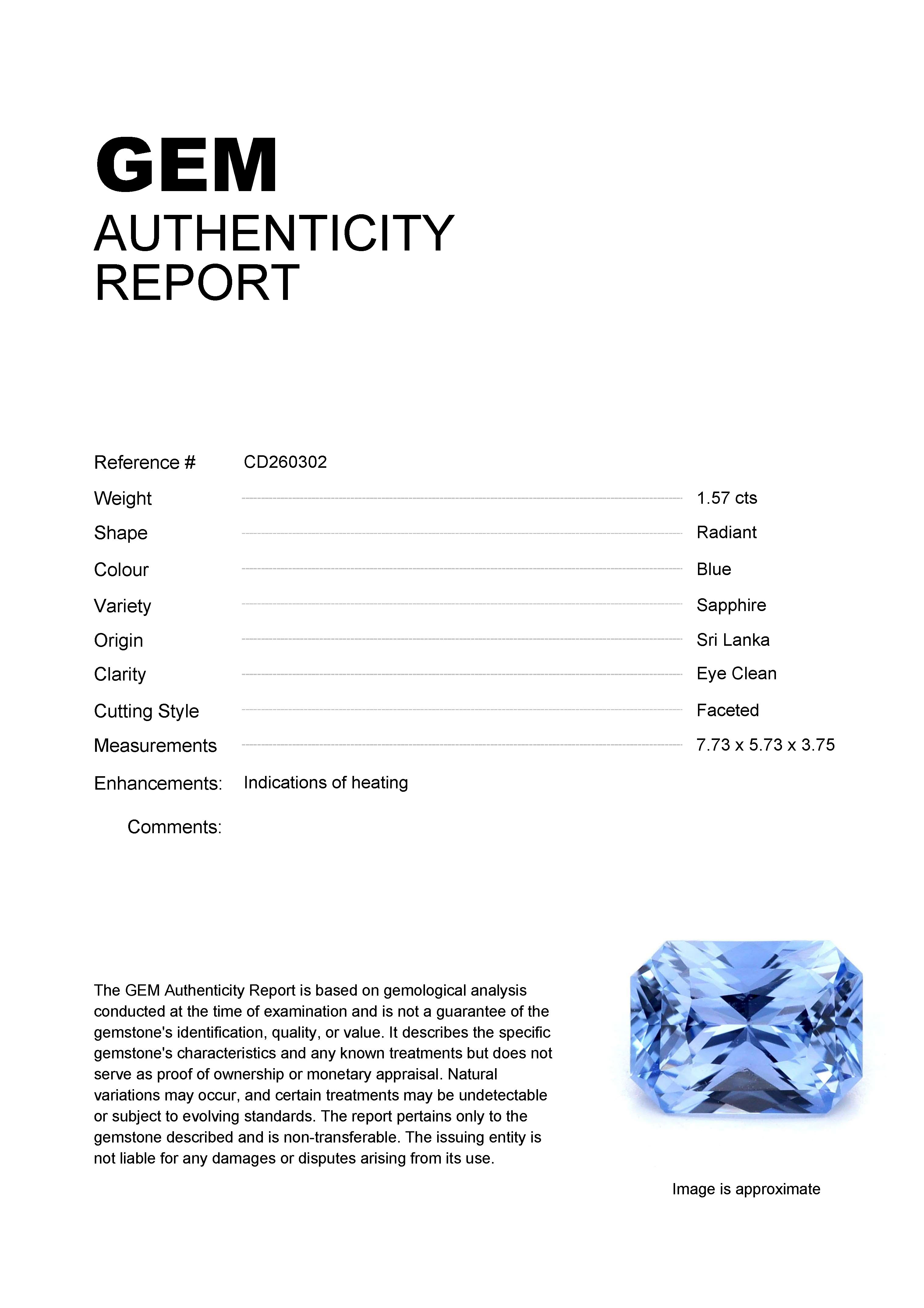 1.57ct Blue Radiant Sri Lanka SapphireCarat: 1.57 ctType: SapphireCut: RadiantColour: BlueOrigin: Sri LankaComment: Heated7.73 x 5.73 x 3.75 mm