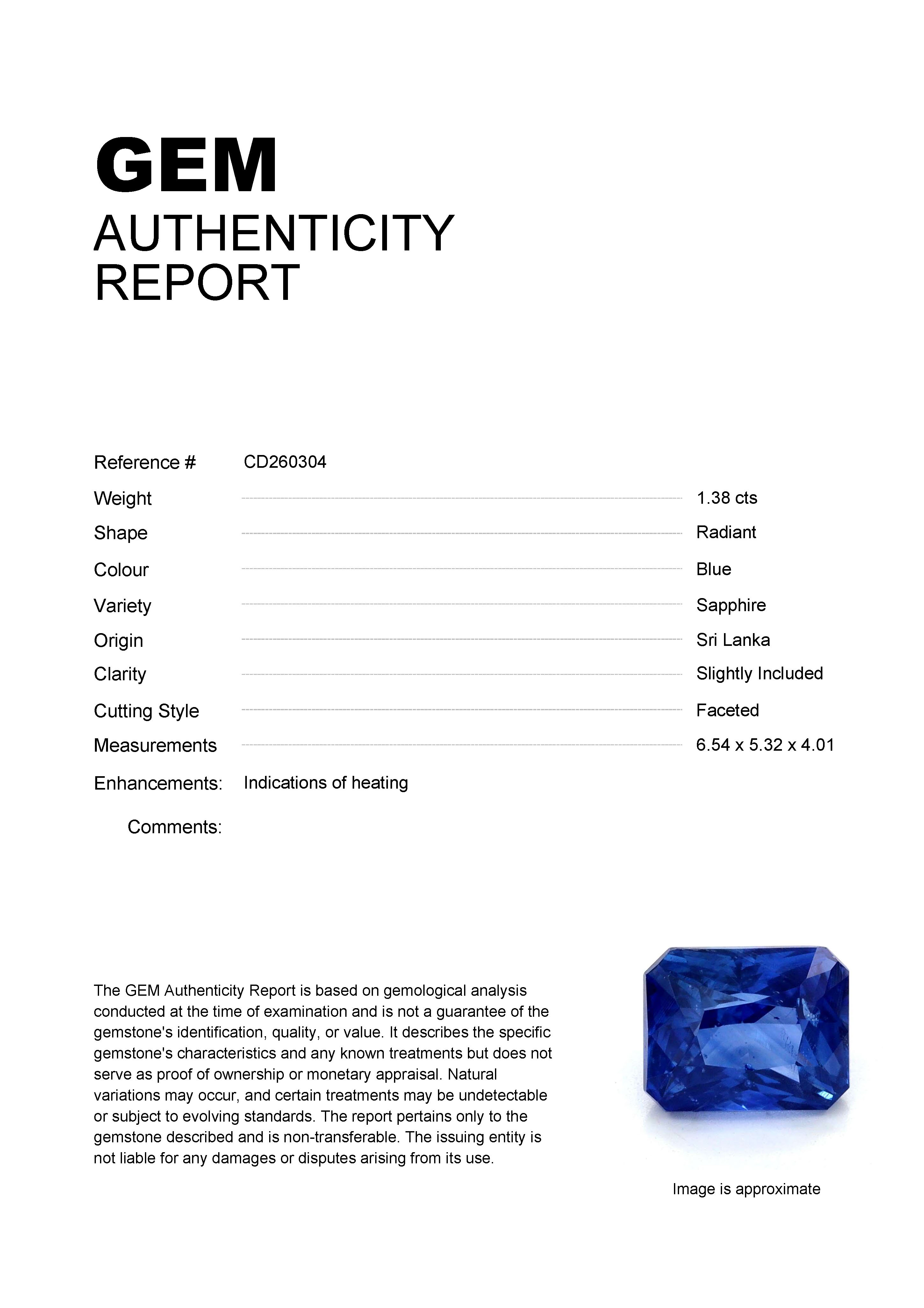 1.38ct Blue Radiant Sri Lanka SapphireCarat: 1.38 ctType: SapphireCut: RadiantColour: BlueOrigin: Sri LankaComment: Heated6.54 x 5.32 x 4.01 mm