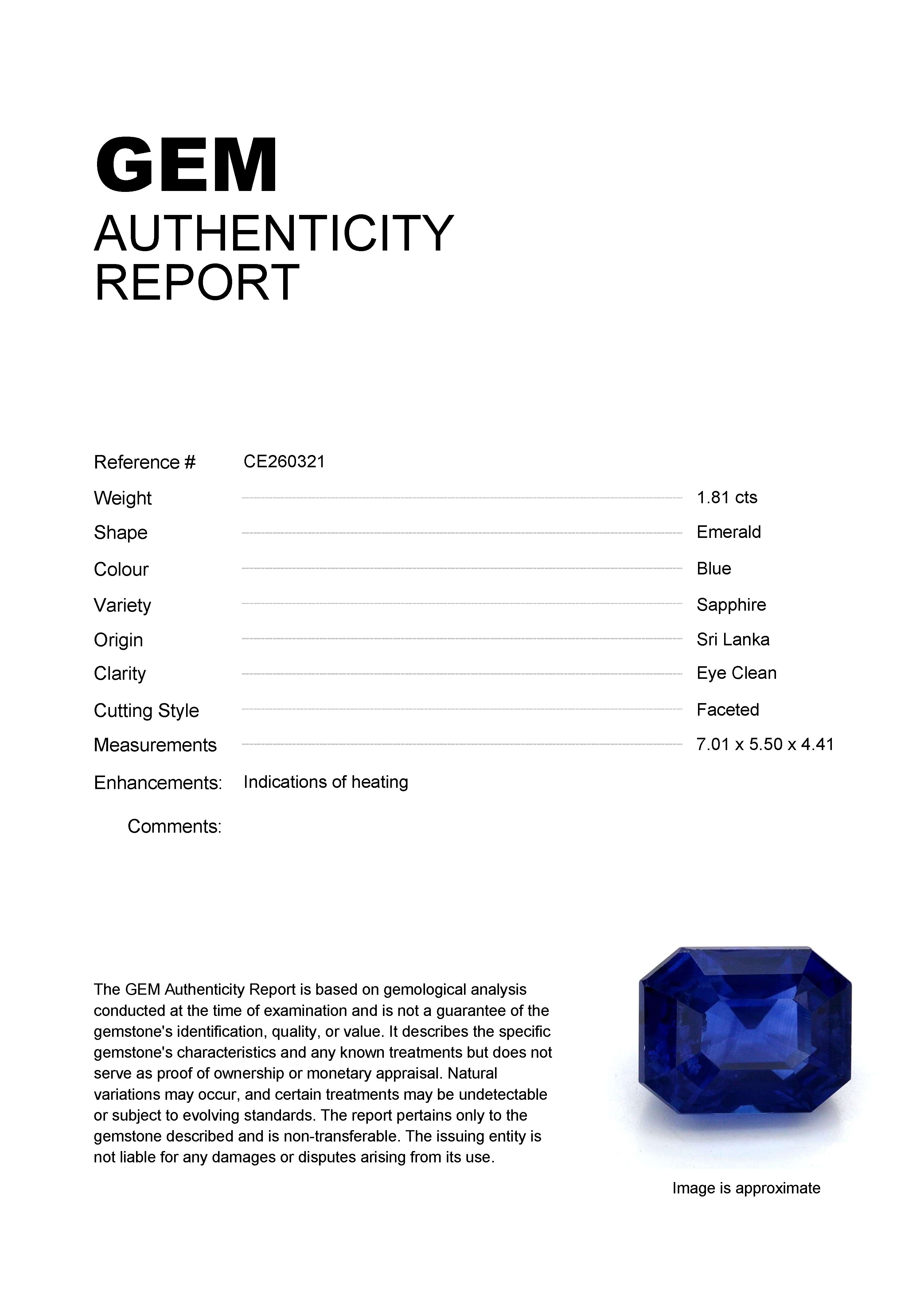 1.81ct Blue Emerald Sri Lanka SapphireCarat: 1.81 ctType: SapphireCut: EmeraldColour: BlueOrigin: Sri LankaComment: Heated7.01 x 5.50 x 4.41 mm