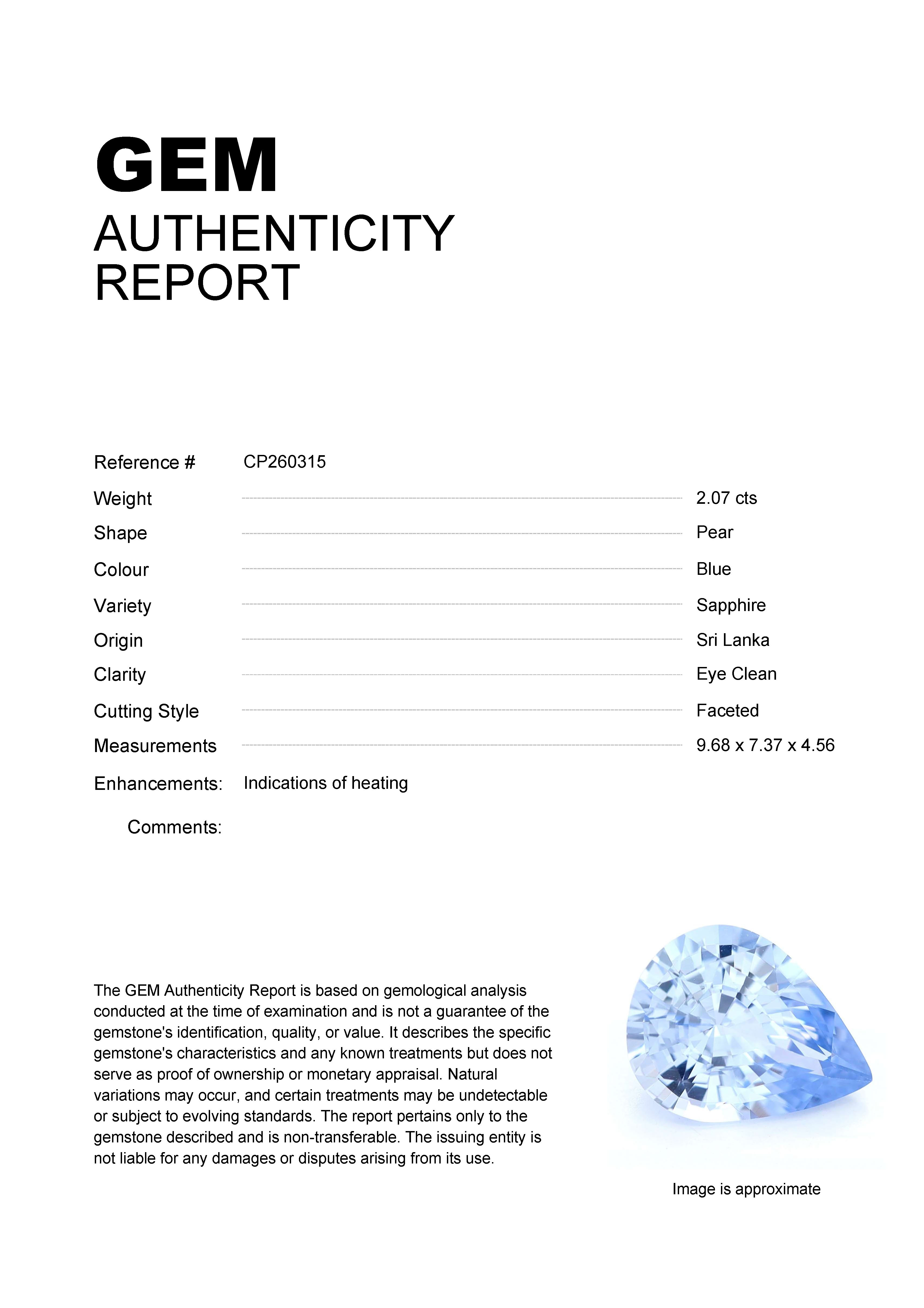 2.07ct Blue Pear Sri Lanka SapphireCarat: 2.07 ctType: SapphireCut: PearColour: BlueOrigin: Sri LankaComment: Heated9.68 x 7.37 x 4.56 mm
