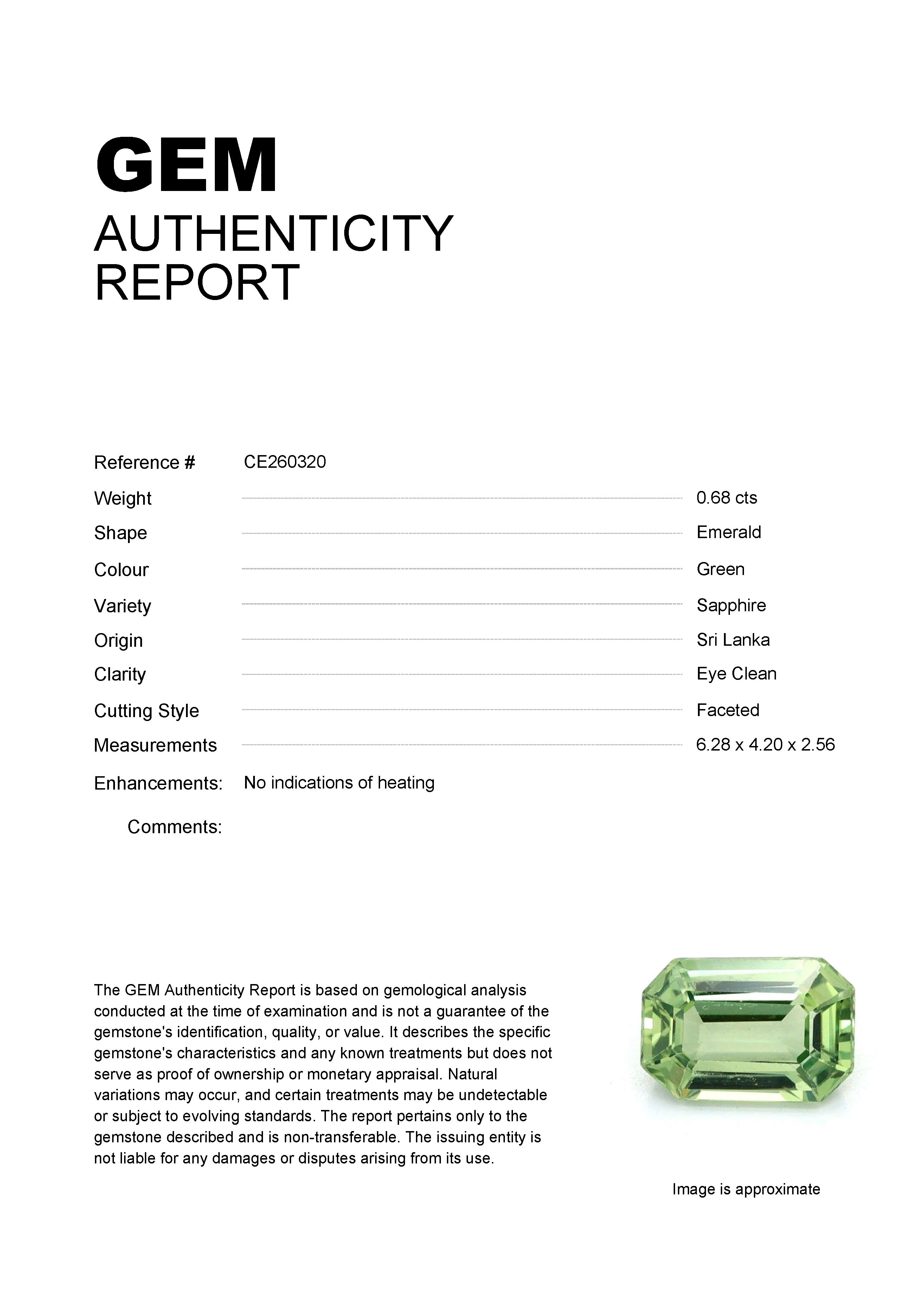 0.68ct Green Emerald Sri Lanka SapphireCarat: 0.68 ctType: SapphireCut: EmeraldColour: GreenOrigin: Sri LankaComment: Not Heated6.28 x 4.20 x 2.56 mm