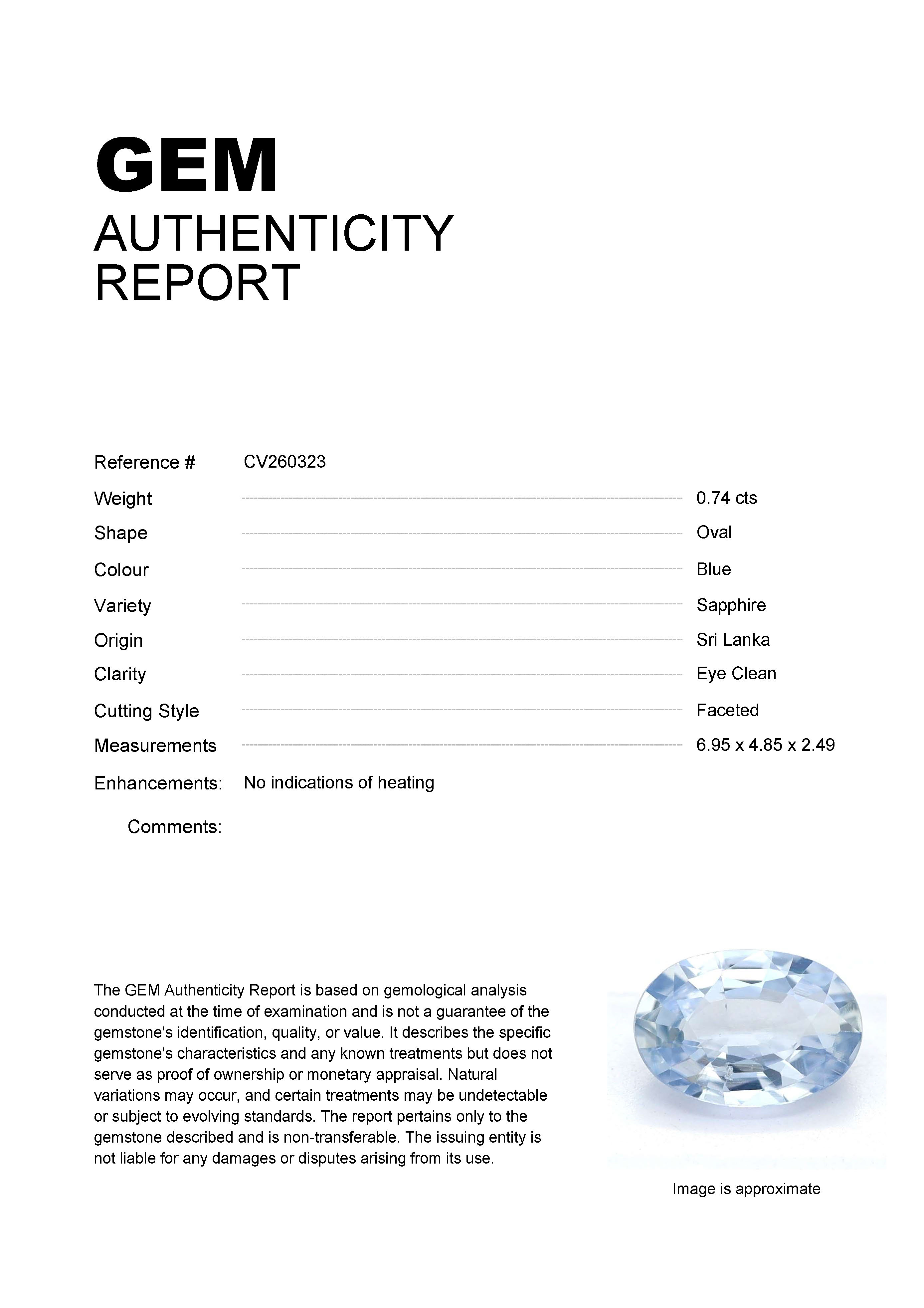 0.74ct Blue Oval Sri Lanka SapphireCarat: 0.74 ctType: SapphireCut: OvalColour: BlueOrigin: Sri LankaComment: Not Heated6.95 x 4.85 x 2.49 mm