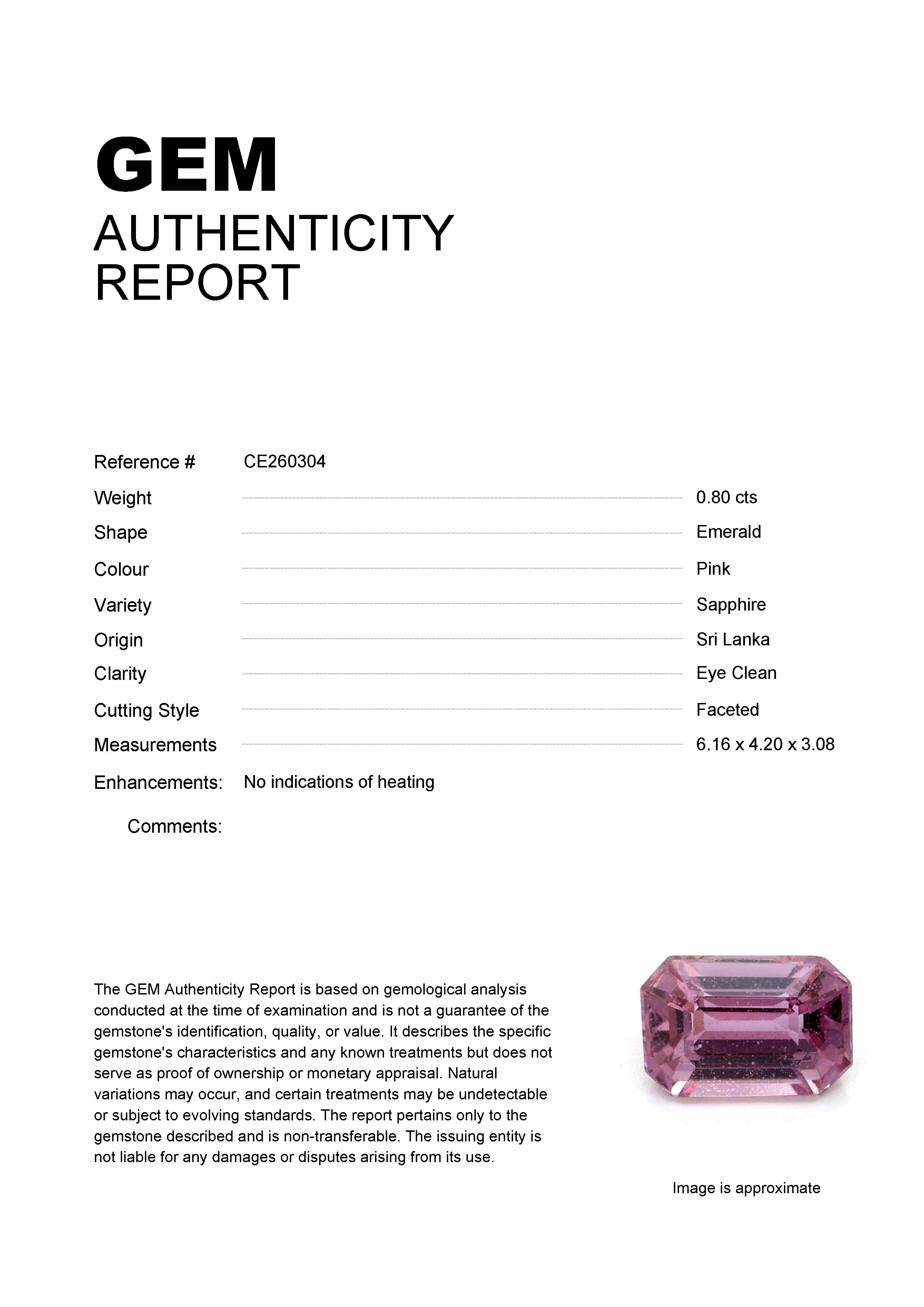 0.80ct Pink Emerald Sri Lanka SapphireCarat: 0.80 ctType: SapphireCut: EmeraldColour: PinkOrigin: Sri LankaComment: Not Heated6.16 x 4.20 x 3.08 mm