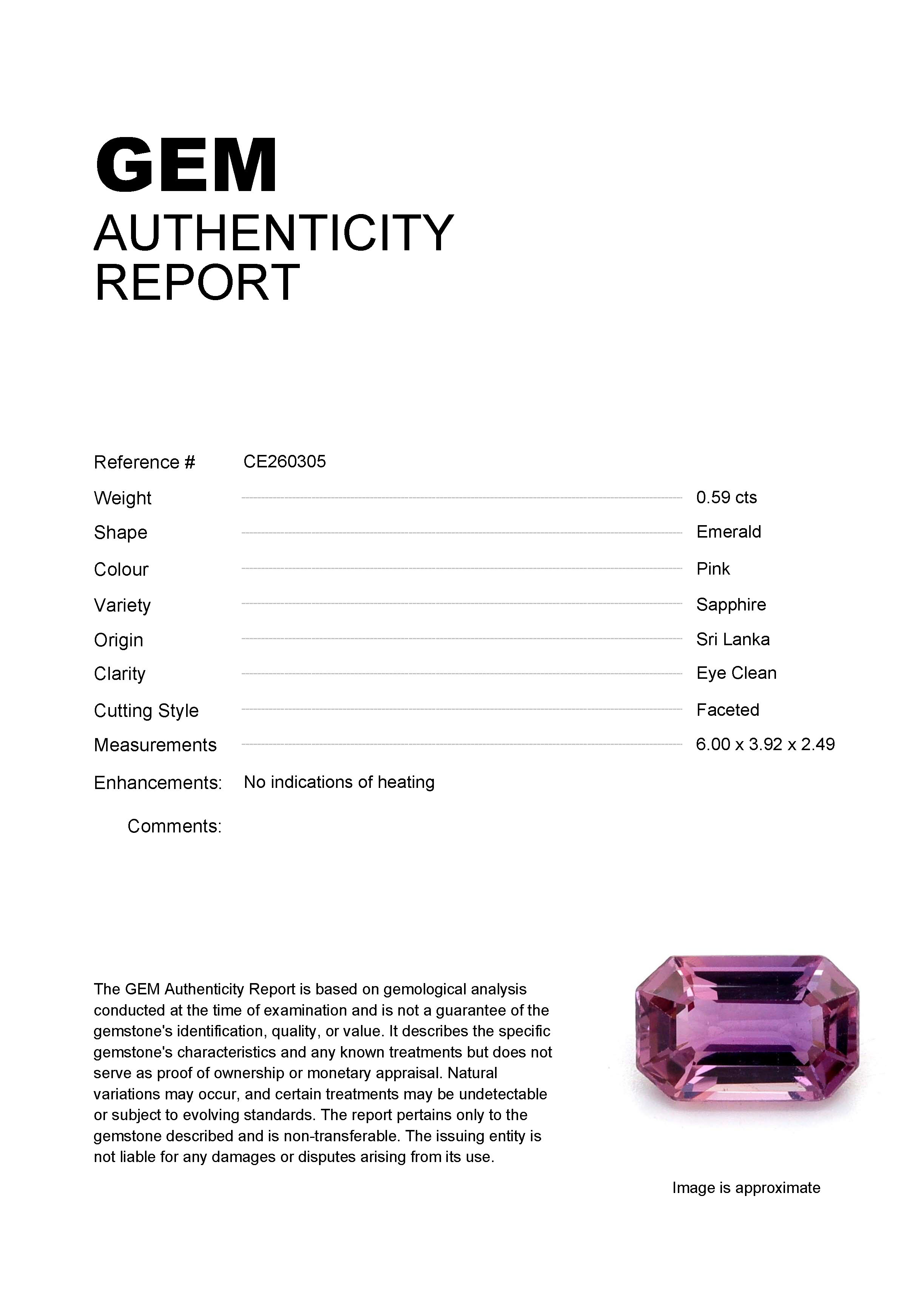 0.59ct Pink Emerald Sri Lanka SapphireCarat: 0.59 ctType: SapphireCut: EmeraldColour: PinkOrigin: Sri LankaComment: Not Heated6.00 x 3.92 x 2.49 mm