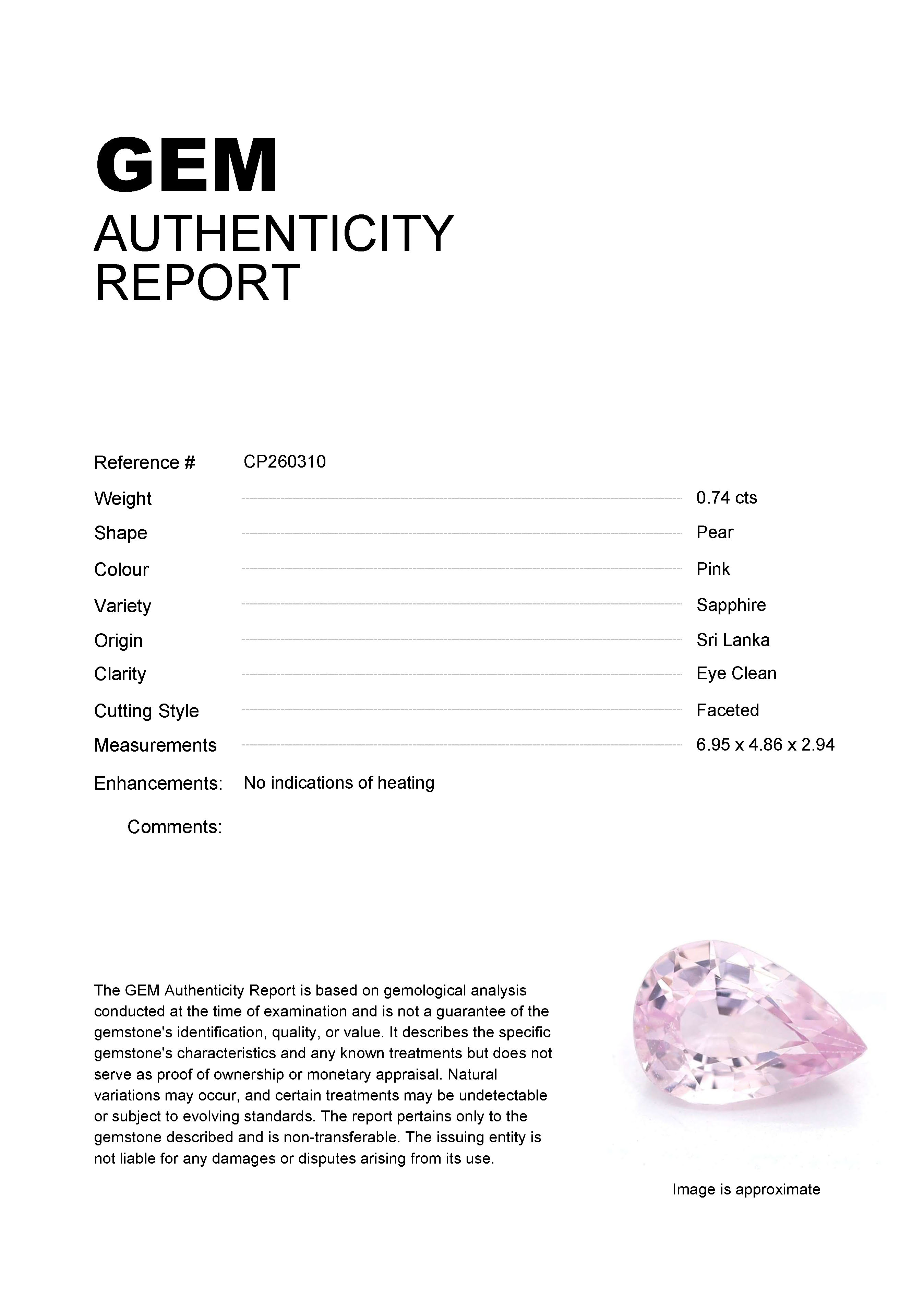 0.74ct Pink Pear Sri Lanka SapphireCarat: 0.74 ctType: SapphireCut: PearColour: PinkOrigin: Sri LankaComment: Not Heated6.95 x 4.86 x 2.94 mm