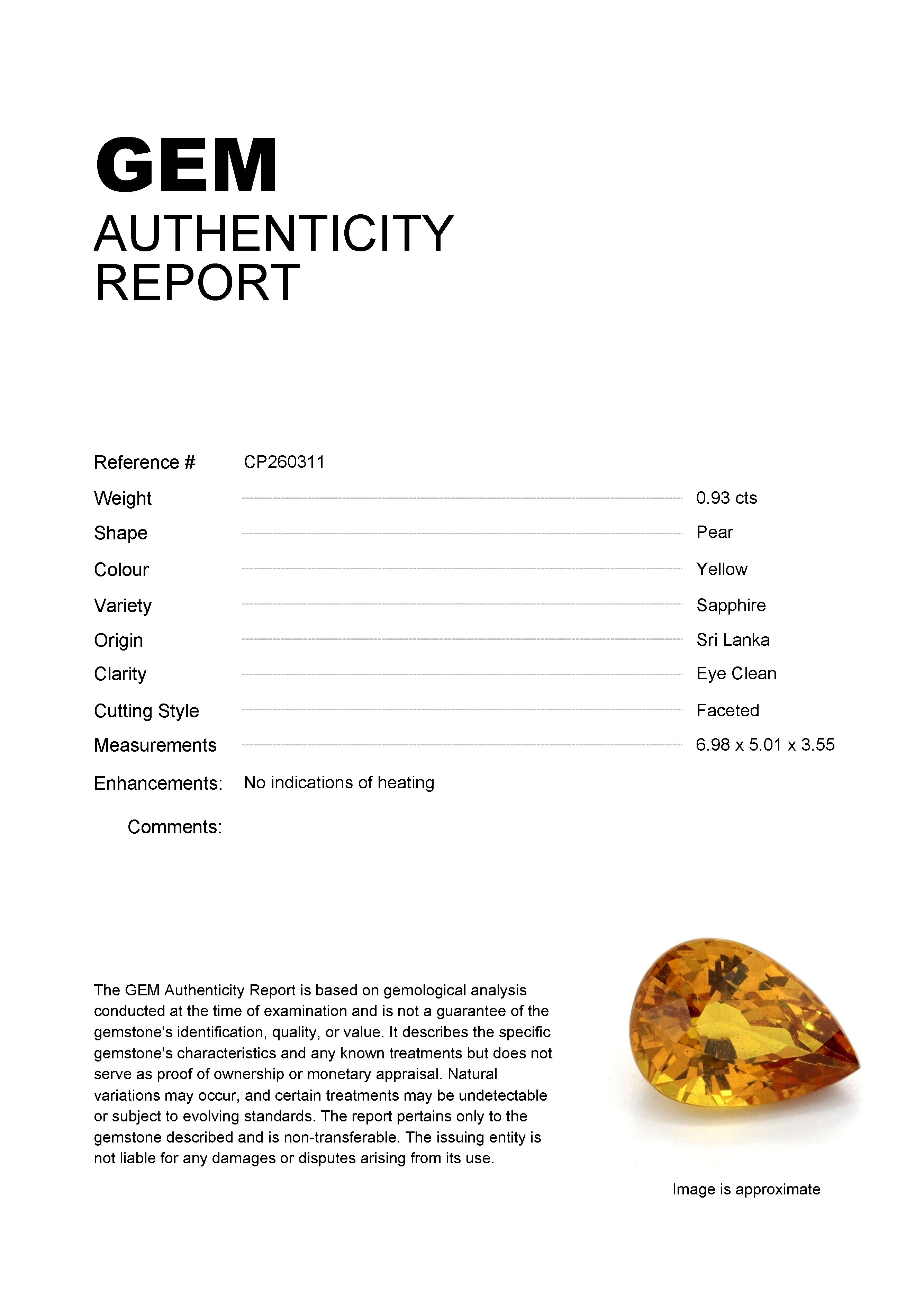 0.93ct Yellow Pear Sri Lanka SapphireCarat: 0.93 ctType: SapphireCut: PearColour: YellowOrigin: Sri LankaComment: Not Heated6.98 x 5.01 x 3.55 mm