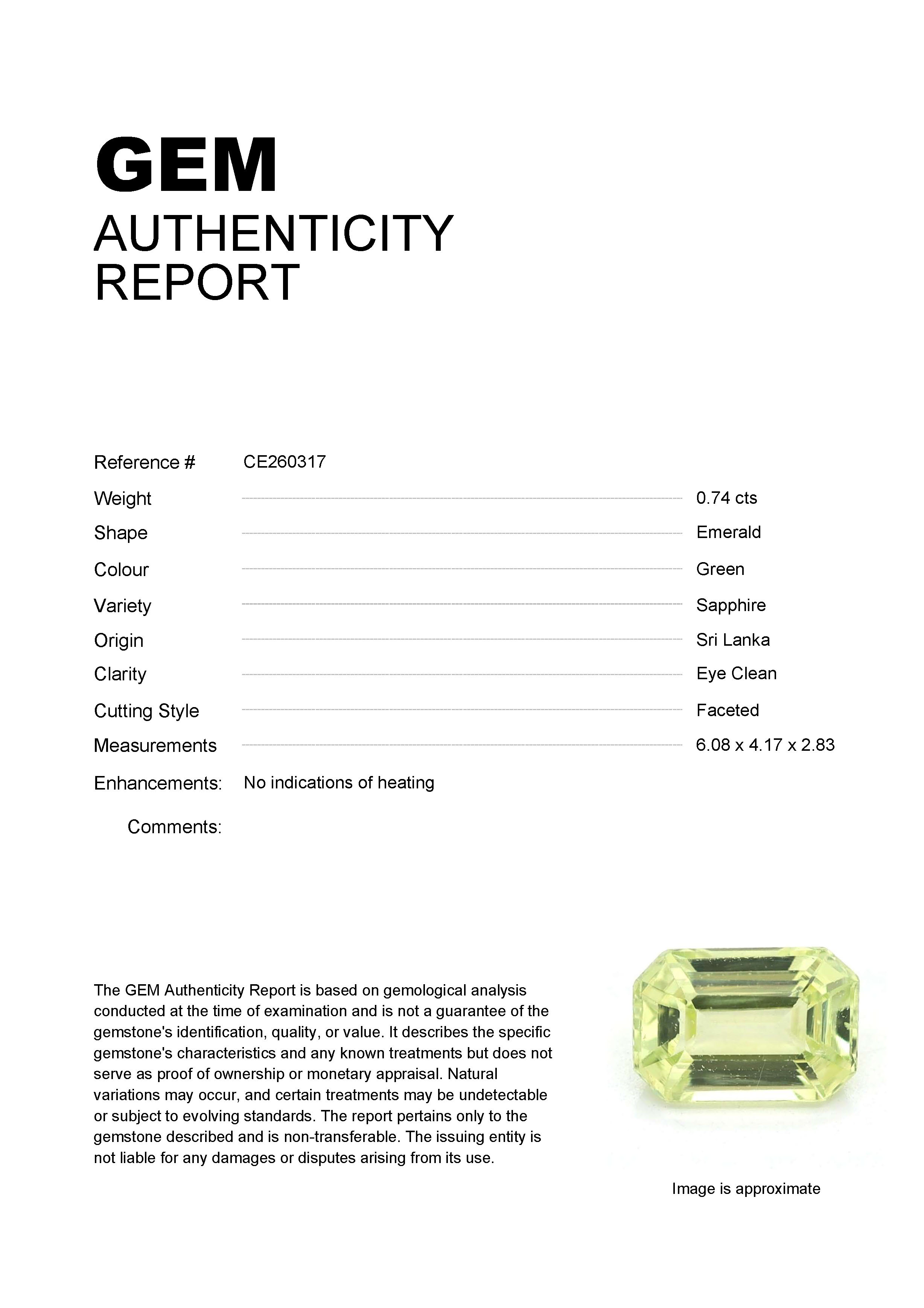 0.74ct Green Emerald Sri Lanka SapphireCarat: 0.74 ctType: SapphireCut: EmeraldColour: GreenOrigin: Sri LankaComment: Not Heated6.08 x 4.17 x 2.83 mm