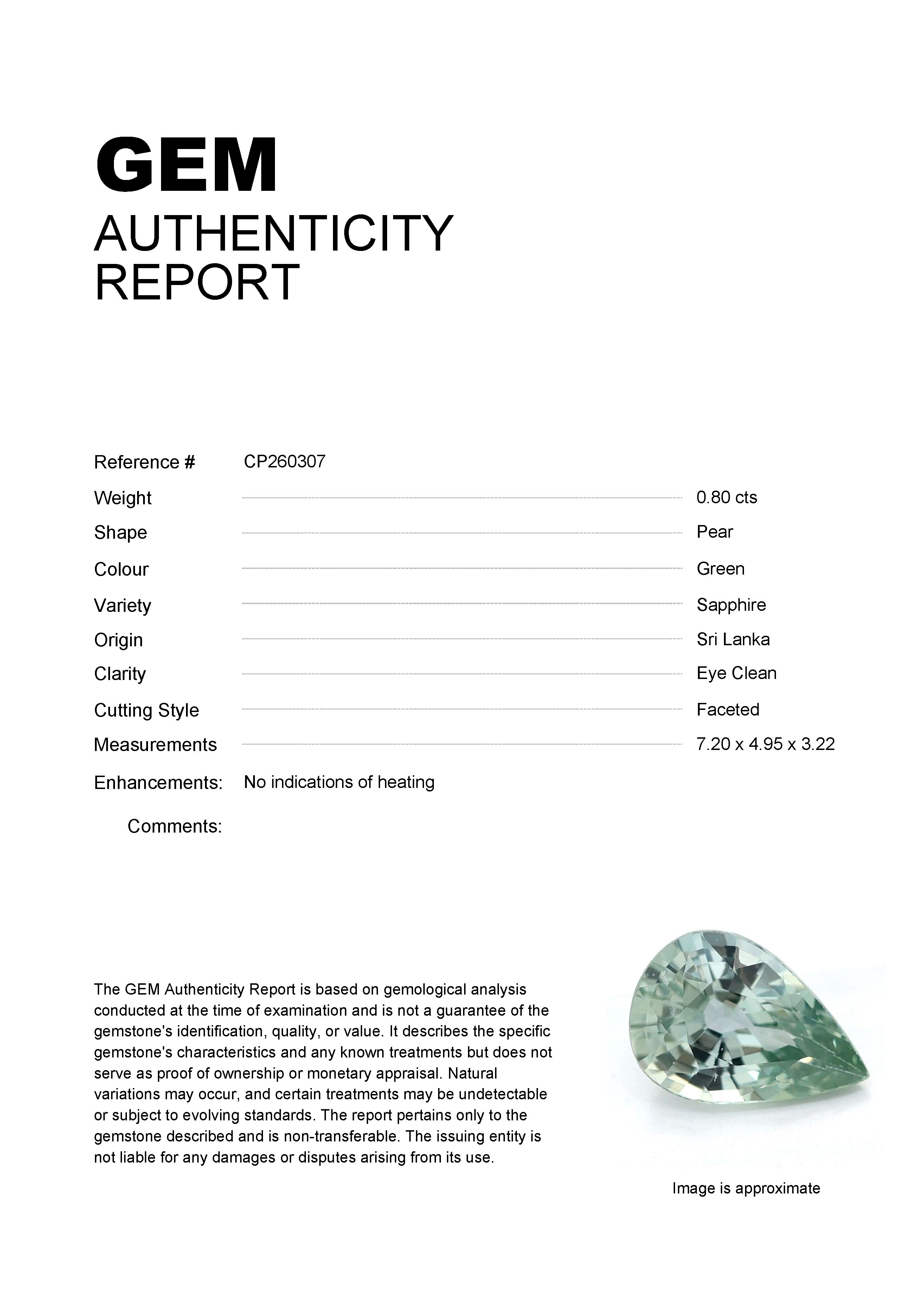 0.80ct Green Pear Sri Lanka SapphireCarat: 0.80 ctType: SapphireCut: PearColour: GreenOrigin: Sri LankaComment: Not Heated7.20 x 4.95 x 3.22 mm