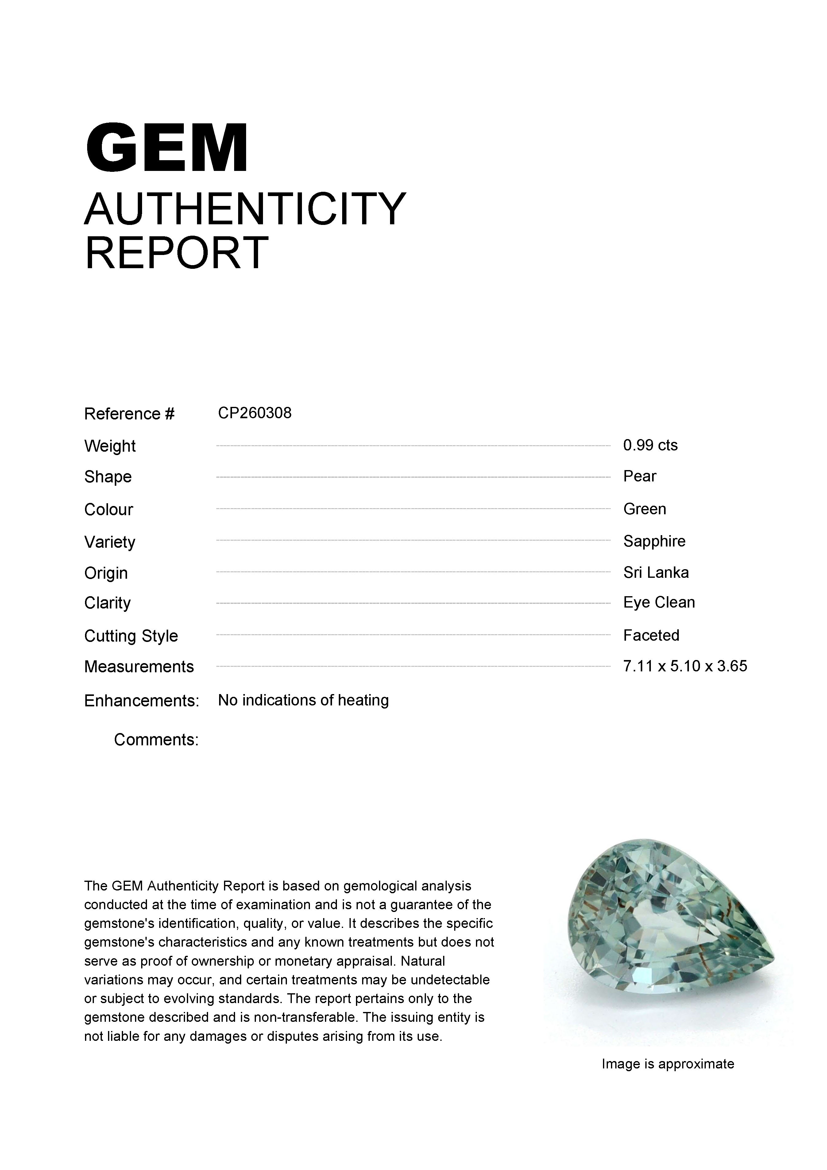 0.99ct Green Pear Sri Lanka SapphireCarat: 0.99 ctType: SapphireCut: PearColour: GreenOrigin: Sri LankaComment: Not Heated7.11 x 5.10 x 3.65 mm