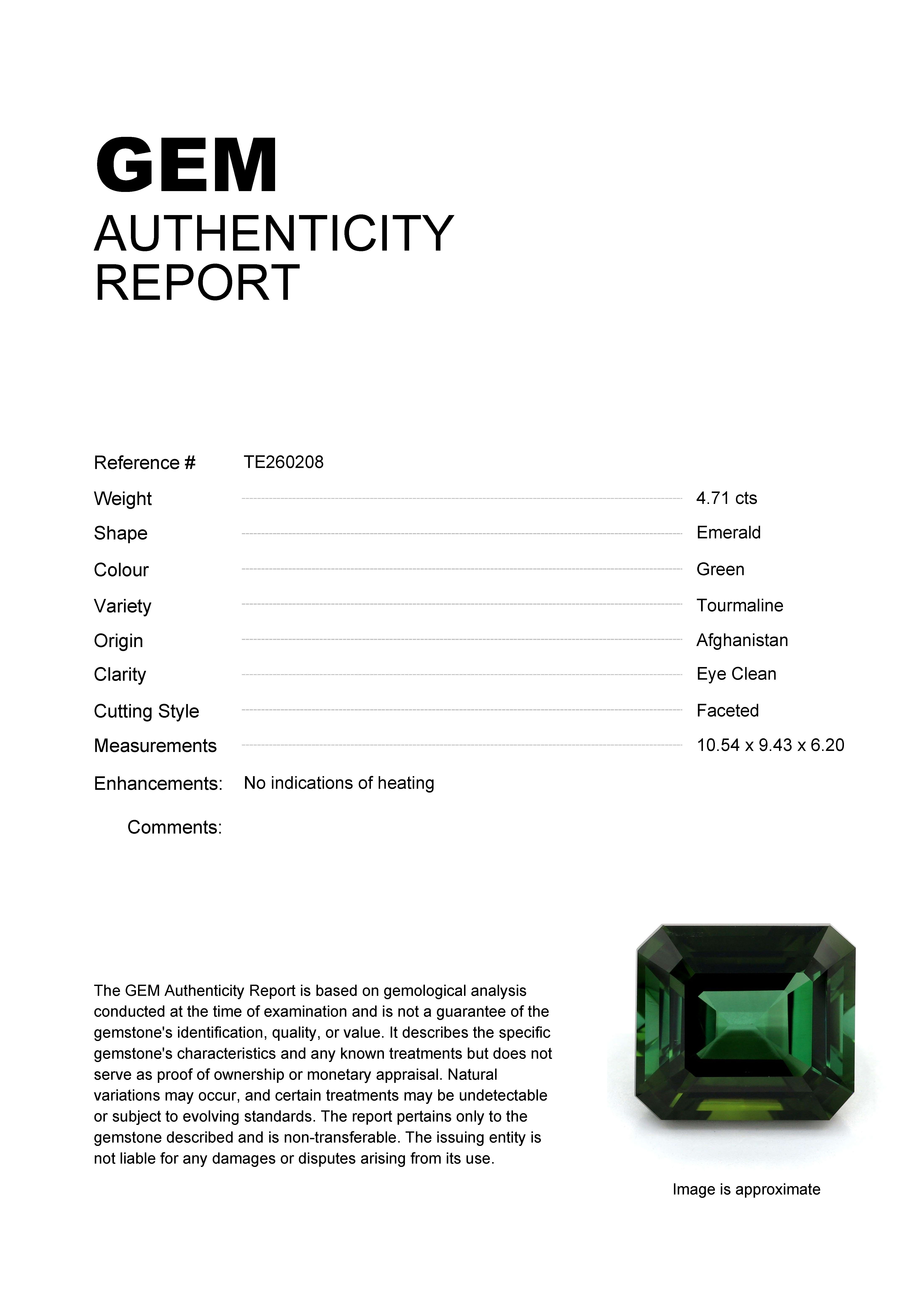4.71ct Green Emerald Afghanistan TourmalineCarat: 4.71 ctType: TourmalineCut: EmeraldColour: GreenOrigin: AfghanistanComment: Not Heated10.54 x 9.43 x 6.20 mm