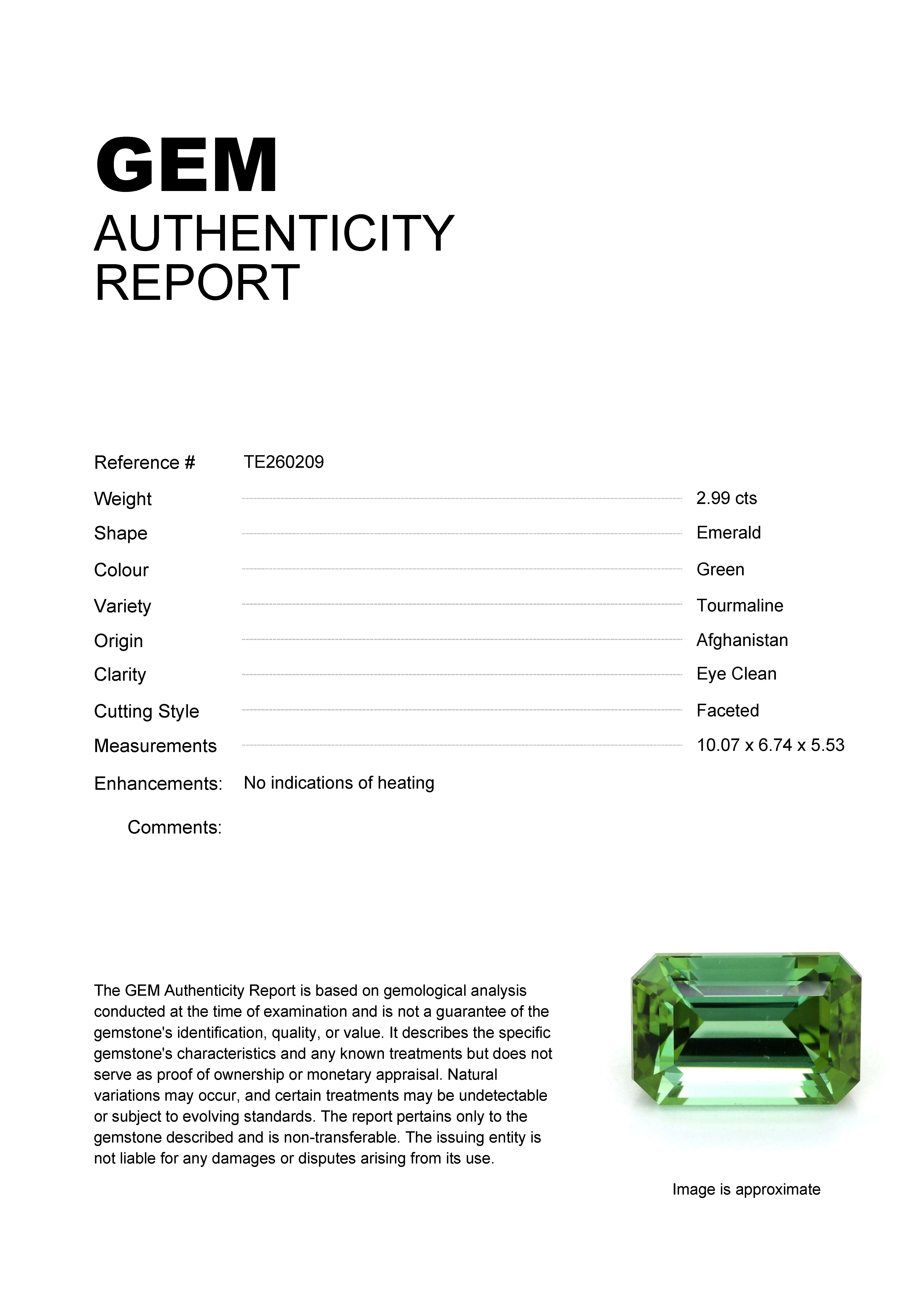 2.99ct Green Emerald Afghanistan TourmalineCarat: 2.99 ctType: TourmalineCut: EmeraldColour: GreenOrigin: AfghanistanComment: Not Heated10.07 x 6.74 x 5.53 mm