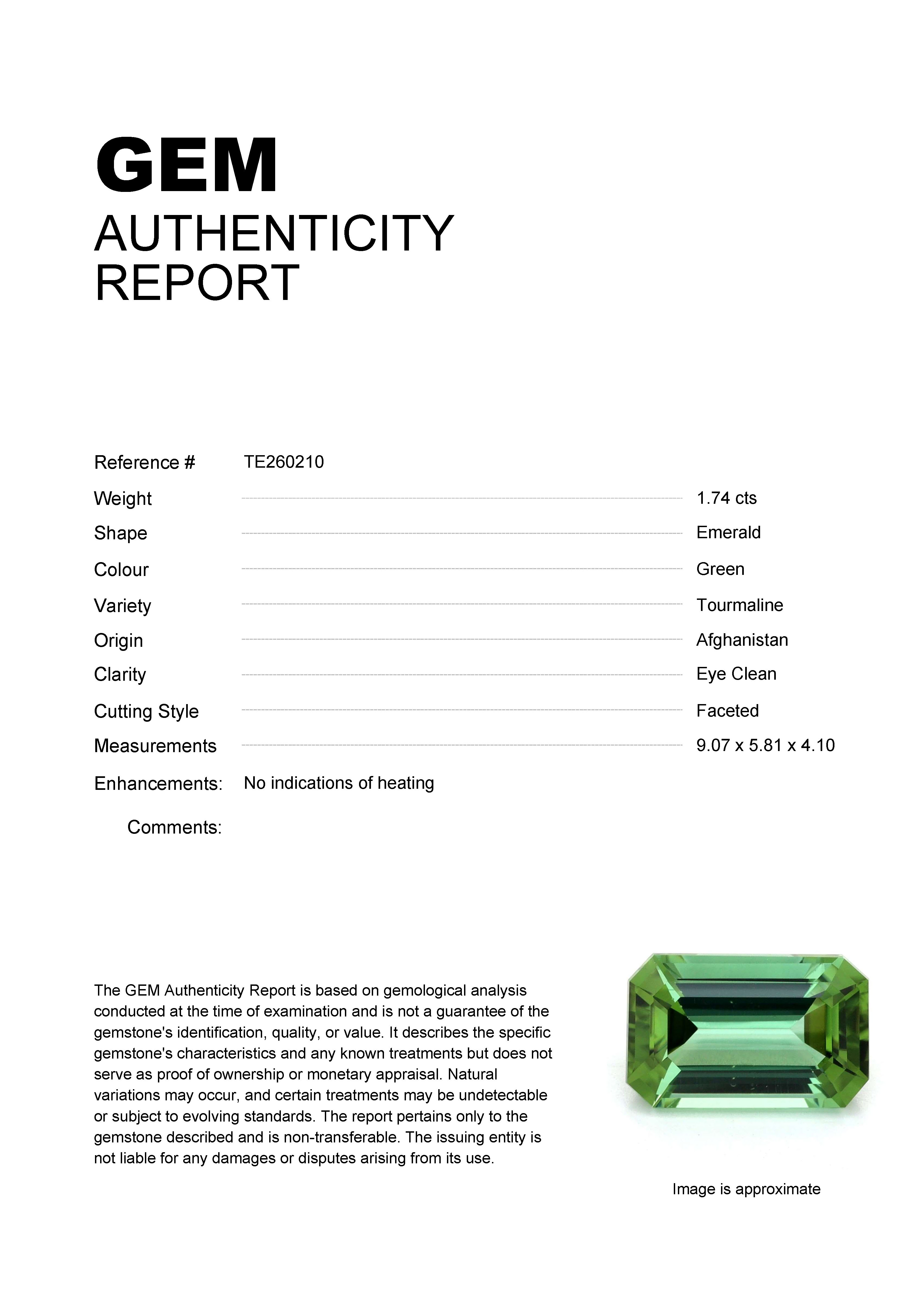 1.74ct Green Emerald Afghanistan TourmalineCarat: 1.74 ctType: TourmalineCut: EmeraldColour: GreenOrigin: AfghanistanComment: Not Heated9.07 x 5.81 x 4.10 mm
