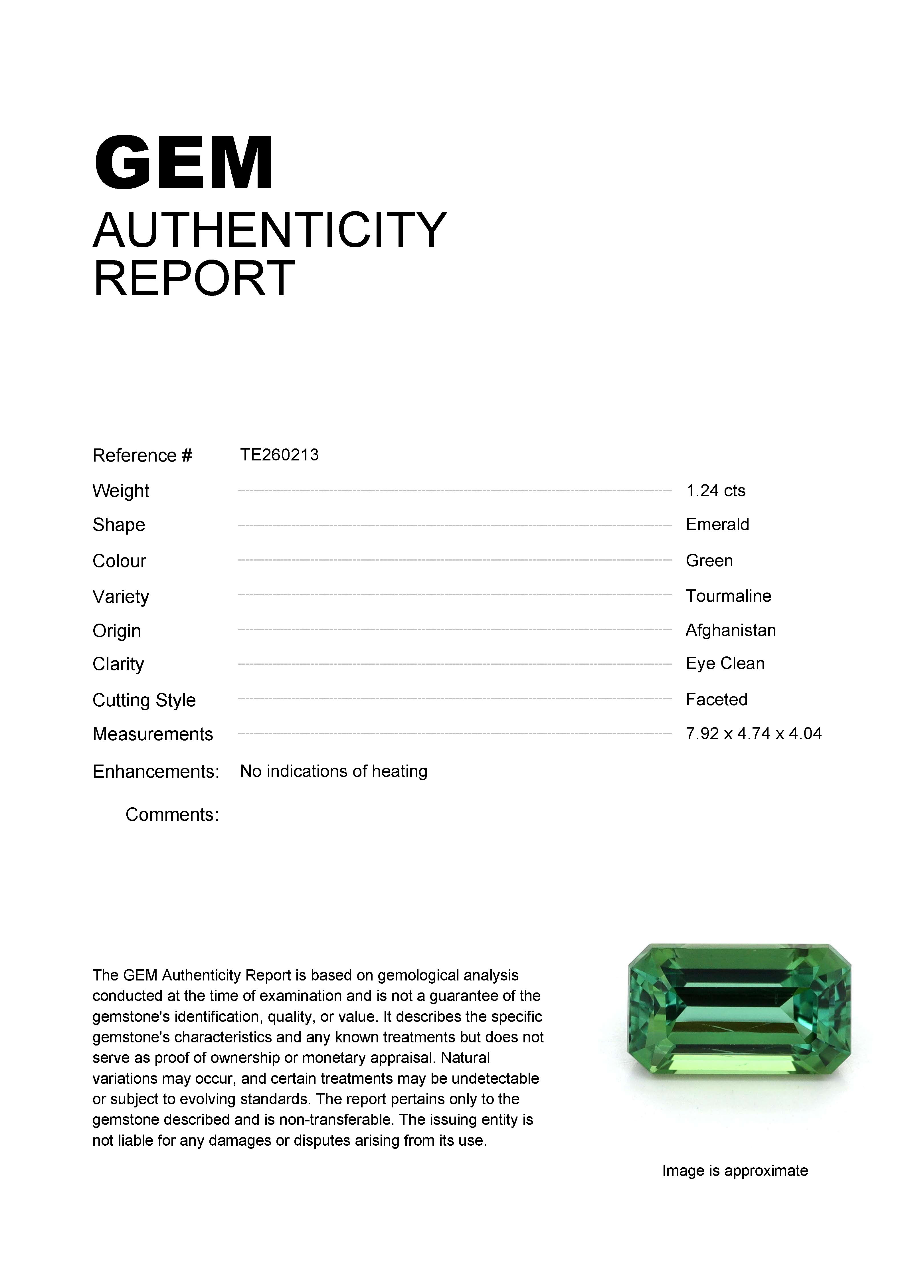 1.24ct Green Emerald Afghanistan TourmalineCarat: 1.24 ctType: TourmalineCut: EmeraldColour: GreenOrigin: AfghanistanComment: Not Heated7.92 x 4.74 x 4.04 mm