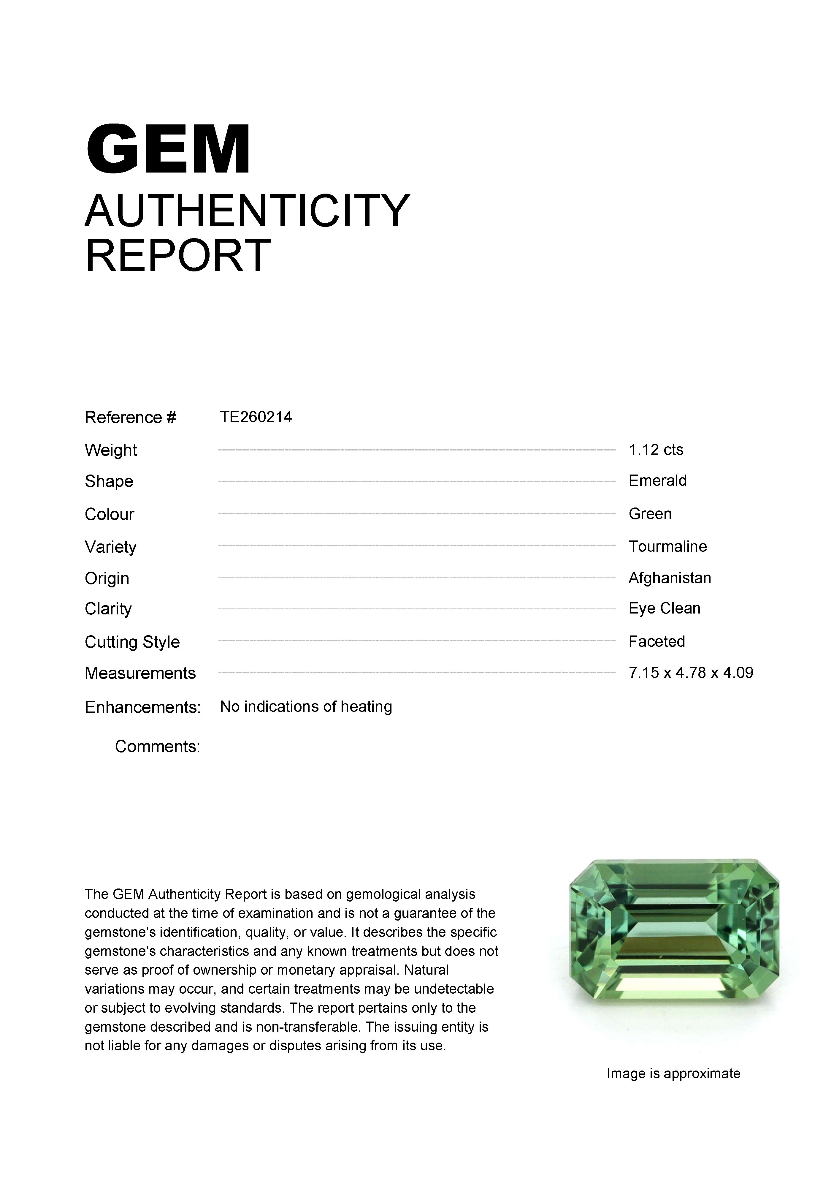 1.12ct Green Emerald Afghanistan TourmalineCarat: 1.12 ctType: TourmalineCut: EmeraldColour: GreenOrigin: AfghanistanComment: Not Heated7.15 x 4.78 x 4.09 mm