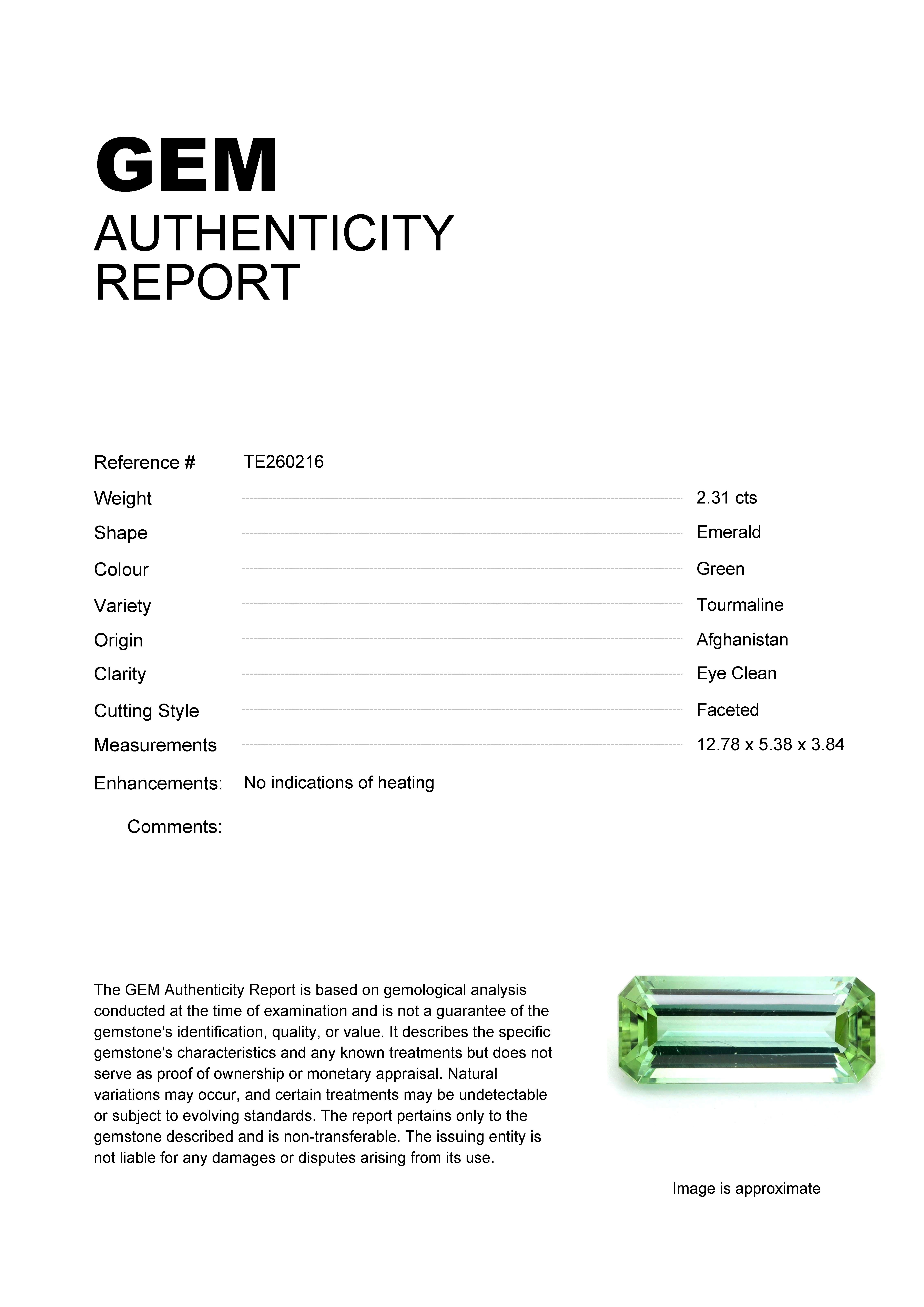 2.31ct Green Emerald Afghanistan TourmalineCarat: 2.31 ctType: TourmalineCut: EmeraldColour: GreenOrigin: AfghanistanComment: Not Heated12.78 x 5.38 x 3.84 mm