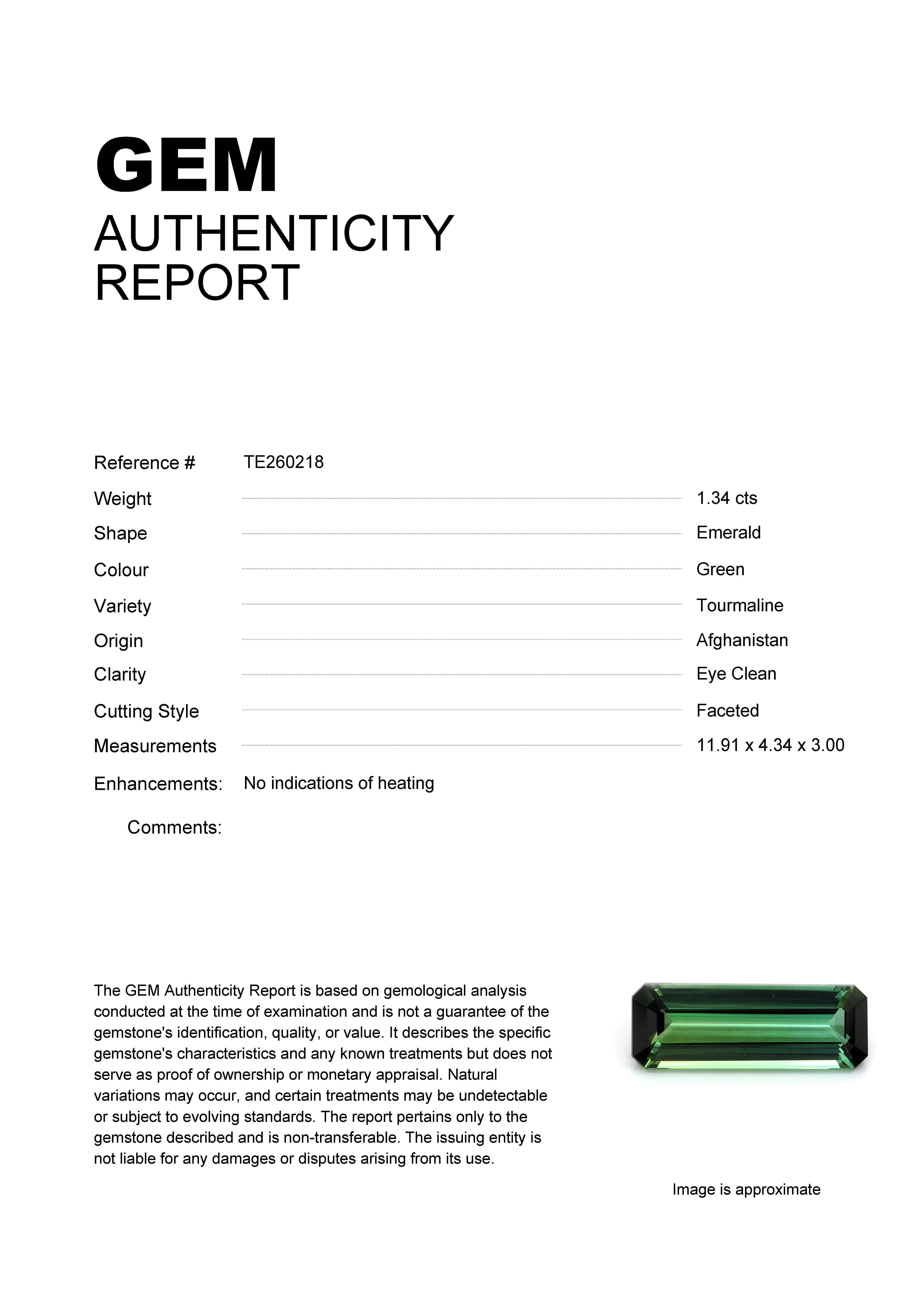 1.34ct Green Emerald Afghanistan TourmalineCarat: 1.34 ctType: TourmalineCut: EmeraldColour: GreenOrigin: AfghanistanComment: Not Heated11.91 x 4.34 x 3.00 mm