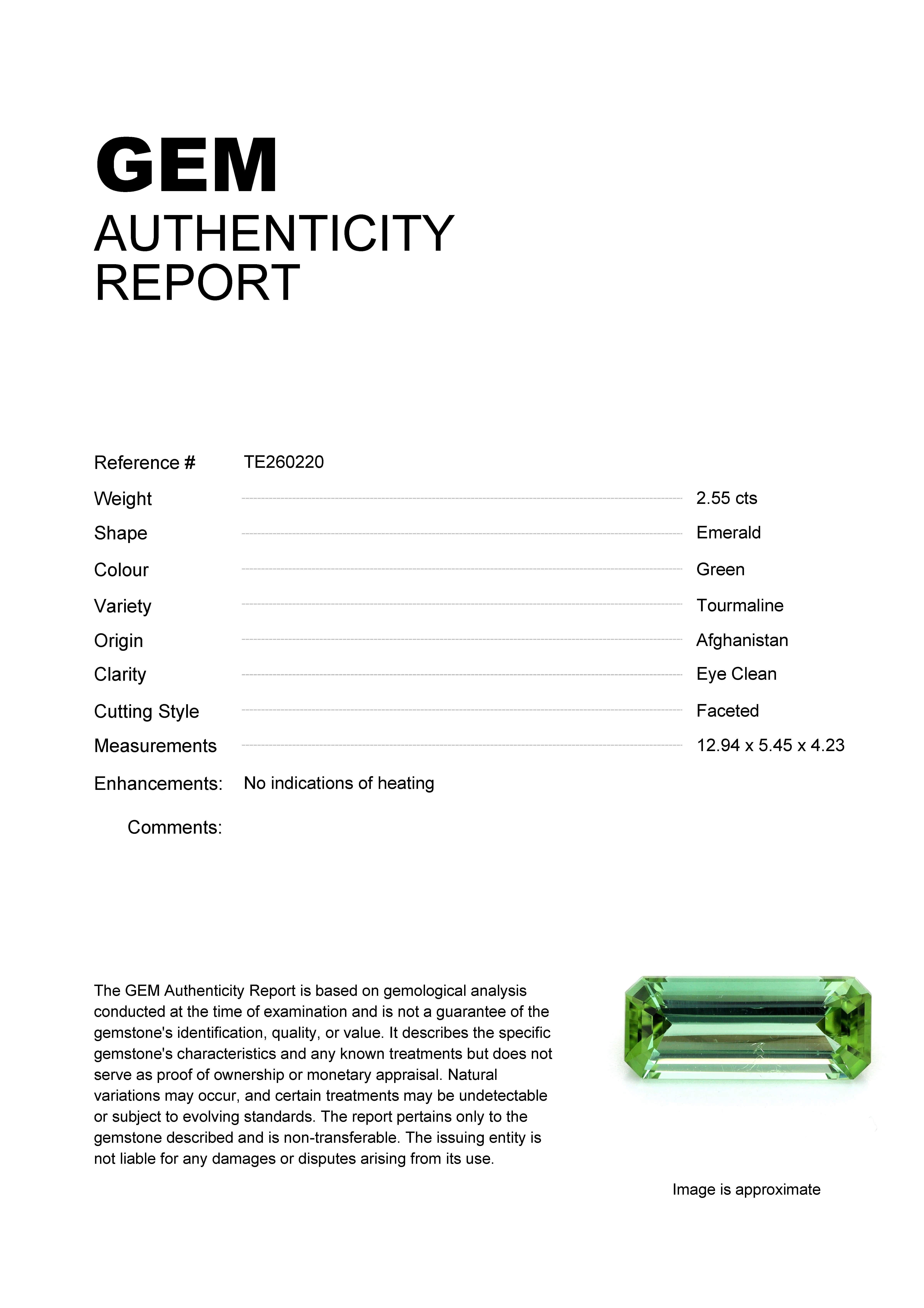 2.55ct Green Emerald Afghanistan TourmalineCarat: 2.55 ctType: TourmalineCut: EmeraldColour: GreenOrigin: AfghanistanComment: Not Heated12.94 x 5.45 x 4.23 mm