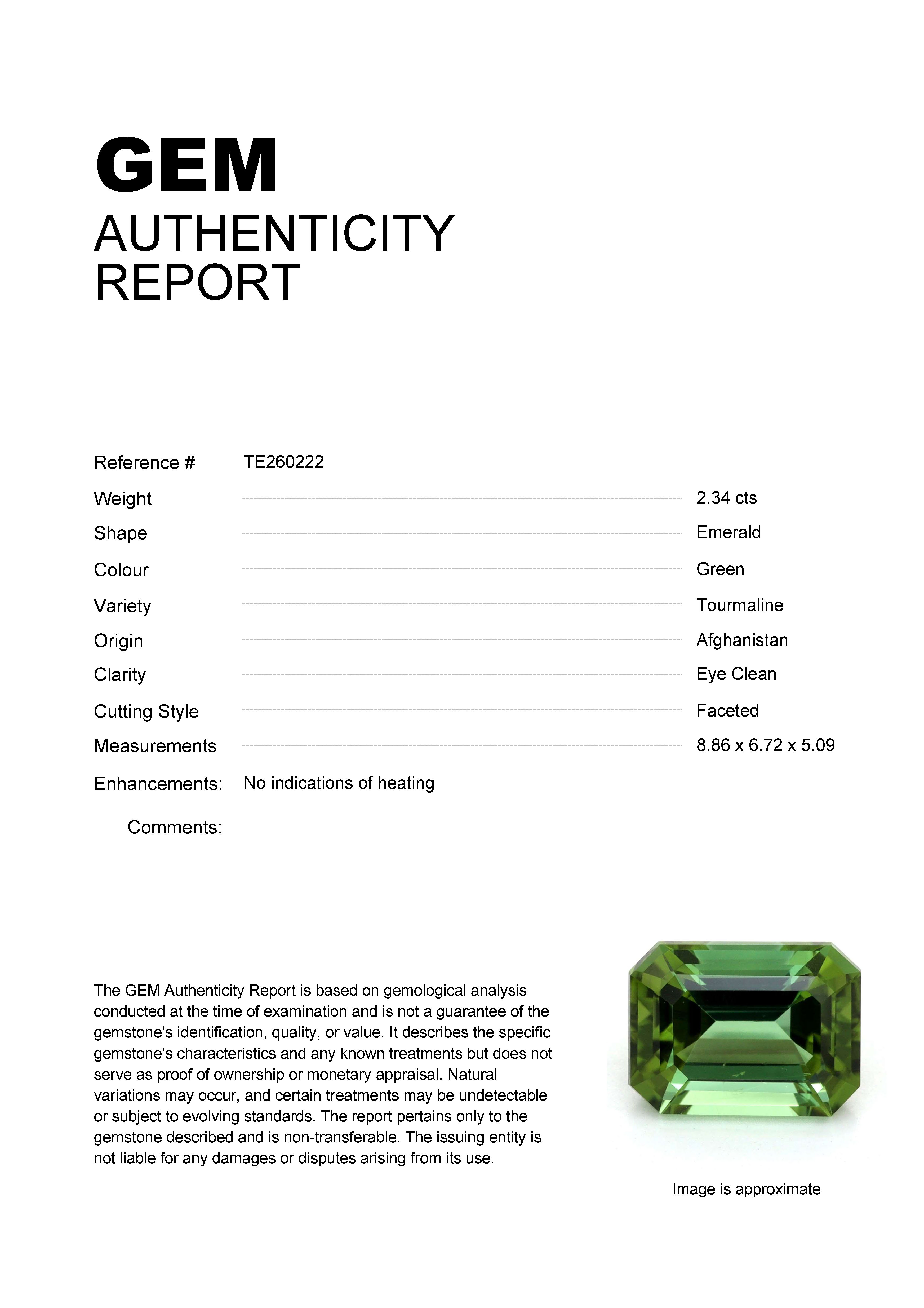 2.34ct Green Emerald Afghanistan TourmalineCarat: 2.34 ctType: TourmalineCut: EmeraldColour: GreenOrigin: AfghanistanComment: Not Heated8.86 x 6.72 x 5.09 mm