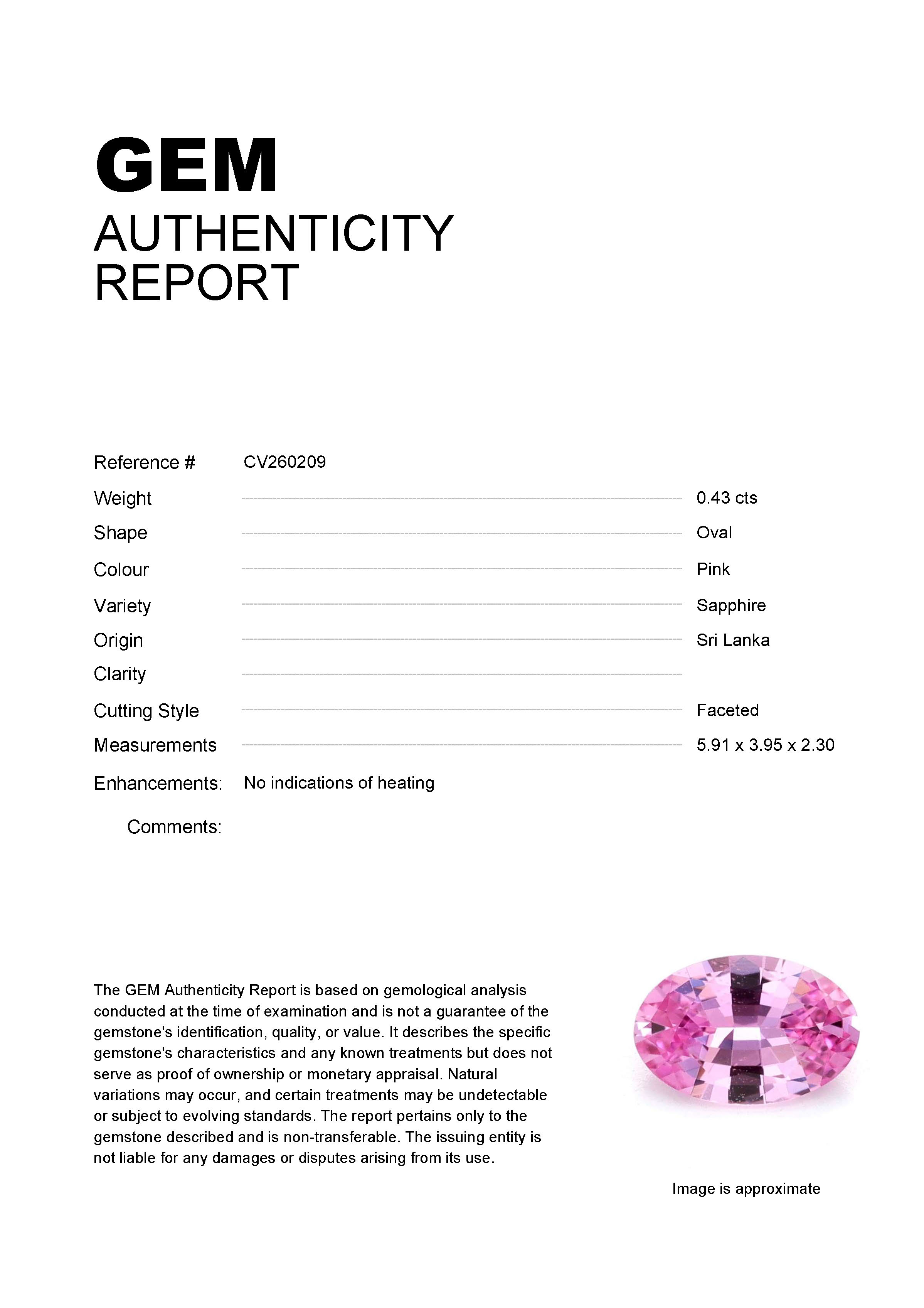 0.43ct Pink Oval Sri Lanka SapphireCarat: 0.43 ctType: SapphireCut: OvalColour: PinkOrigin: Sri LankaComment: Not Heated5.91 x 3.95 x 2.30 mm