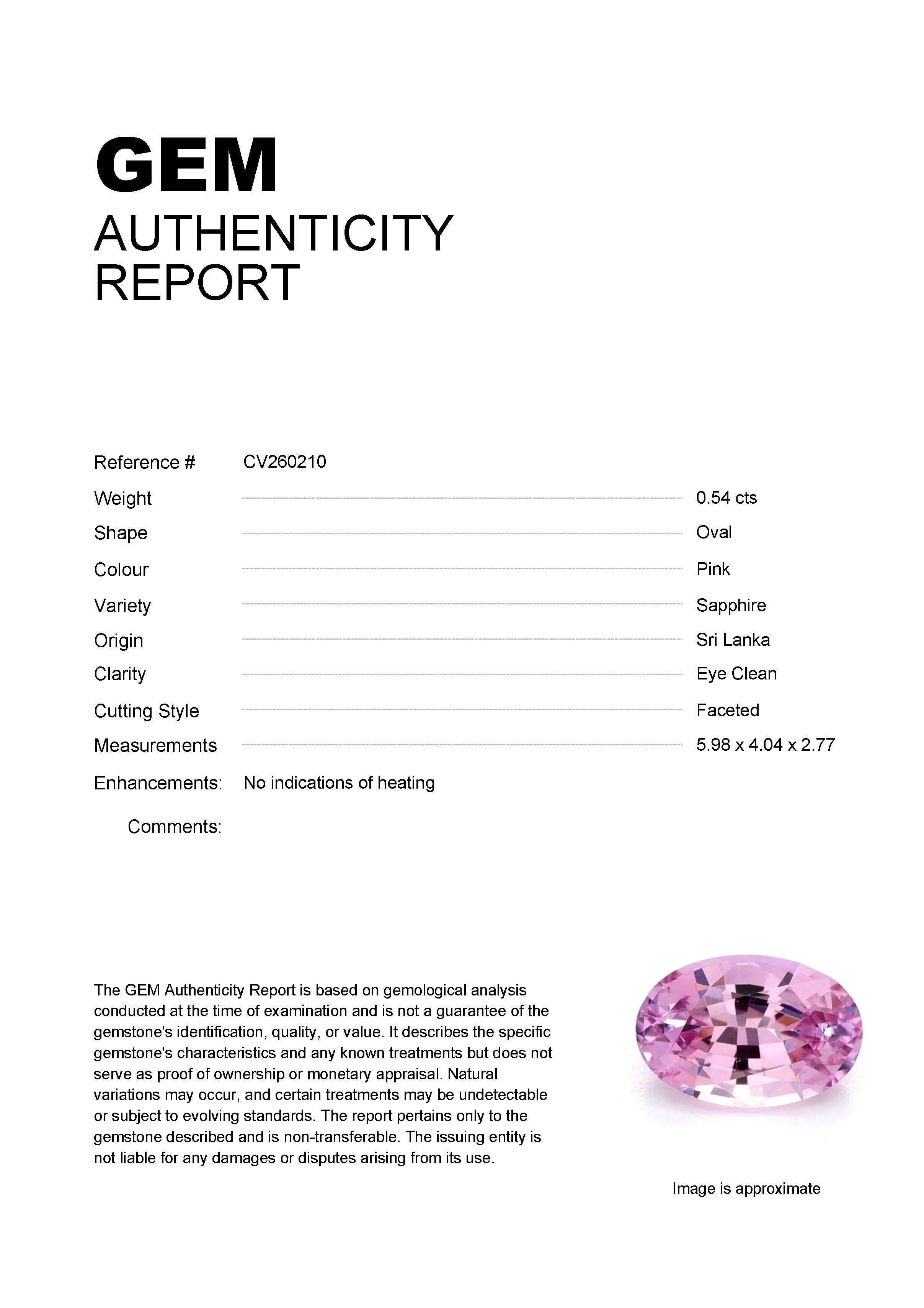 0.54ct Pink Oval Sri Lanka SapphireCarat: 0.54 ctType: SapphireCut: OvalColour: PinkOrigin: Sri LankaComment: Not Heated5.98 x 4.04 x 2.77 mm