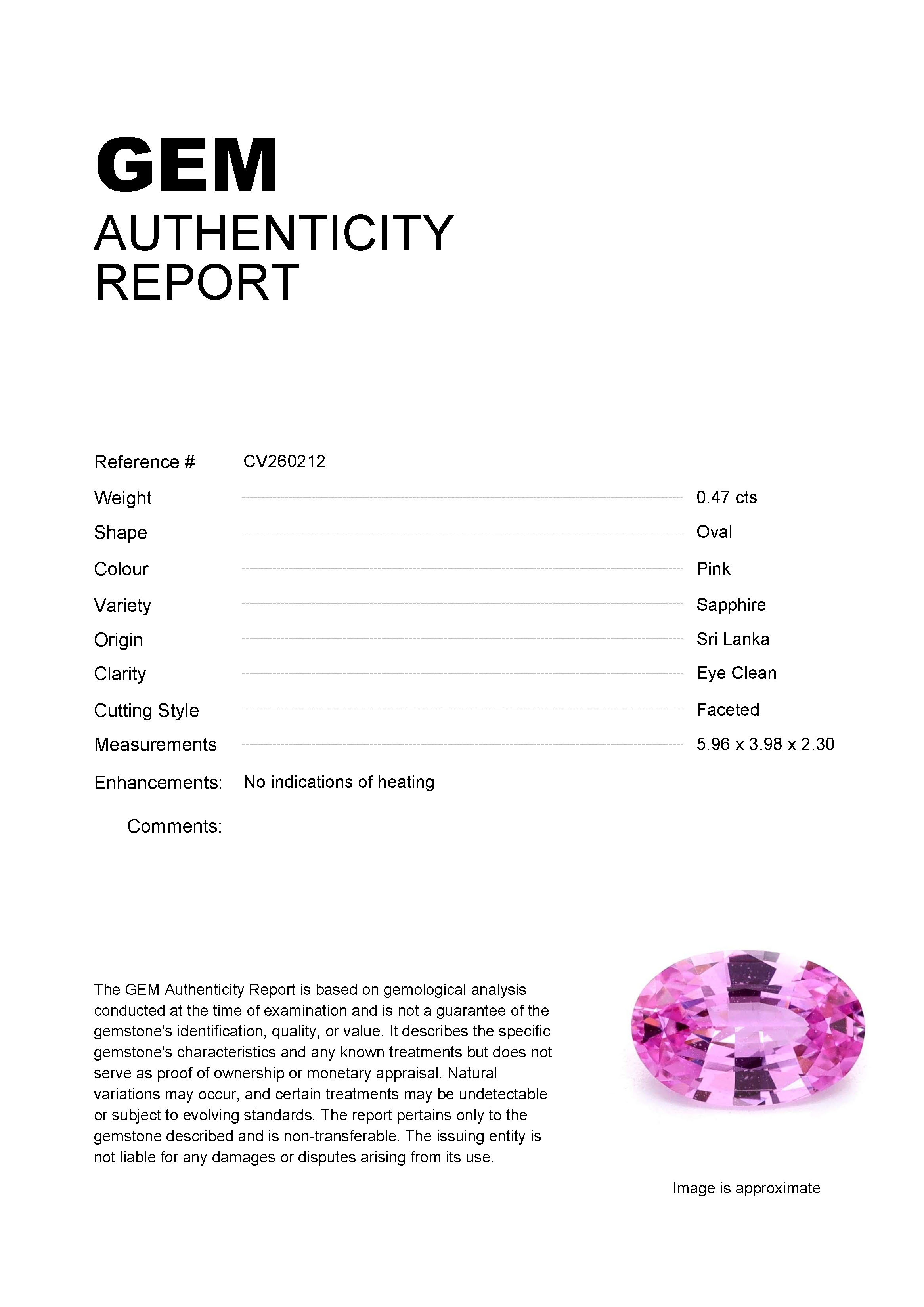 0.48ct Pink Oval Sri Lanka SapphireCarat: 0.48 ctType: SapphireCut: OvalColour: PinkOrigin: Sri LankaComment: Not Heated5.90 x 3.95 x 2.46 mm