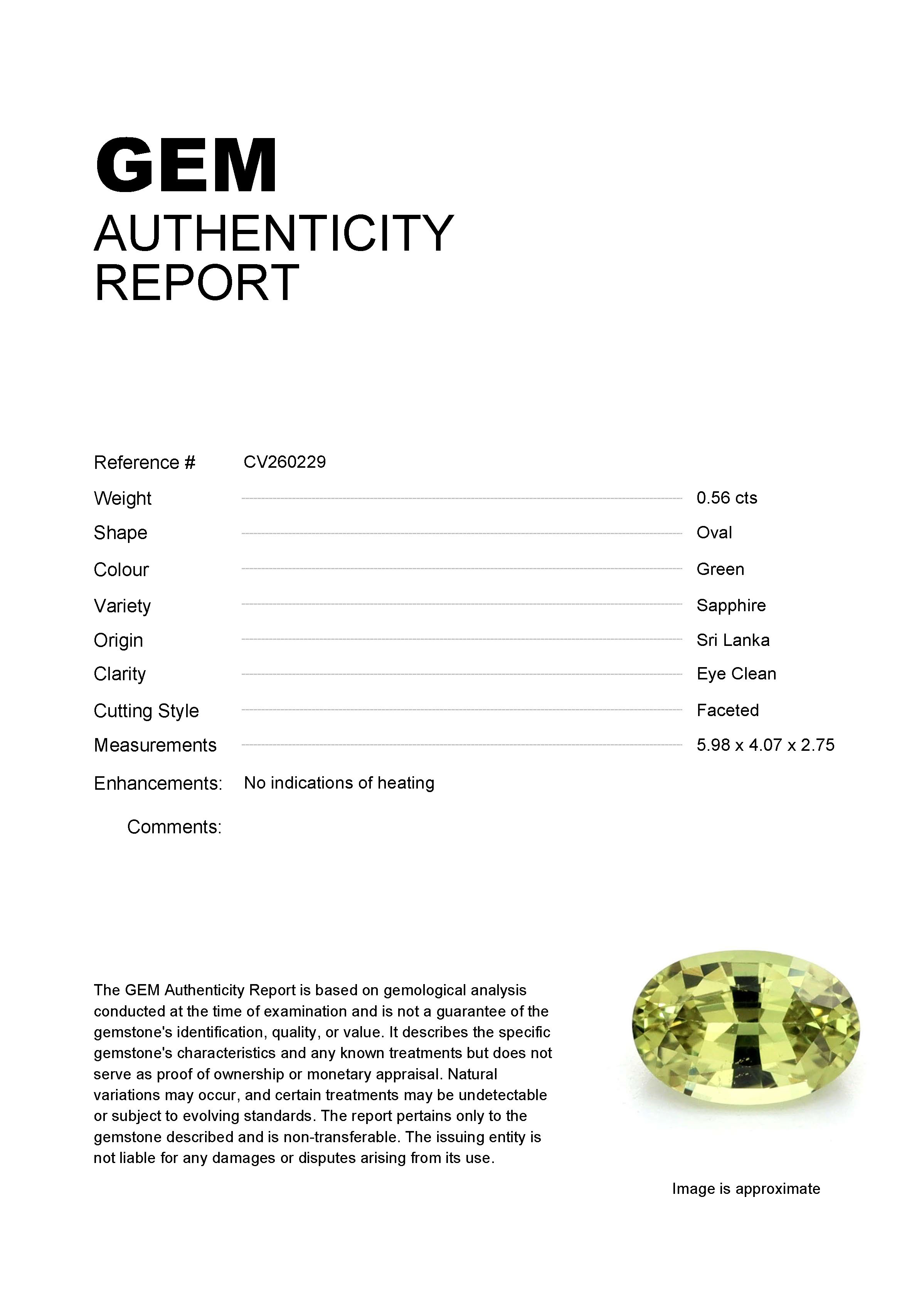 0.65ct Green Oval Sri Lanka SapphireCarat: 0.65 ctType: SapphireCut: OvalColour: GreenOrigin: Sri LankaComment: Not Heated5.97 x 4.08 x 3.09 mm