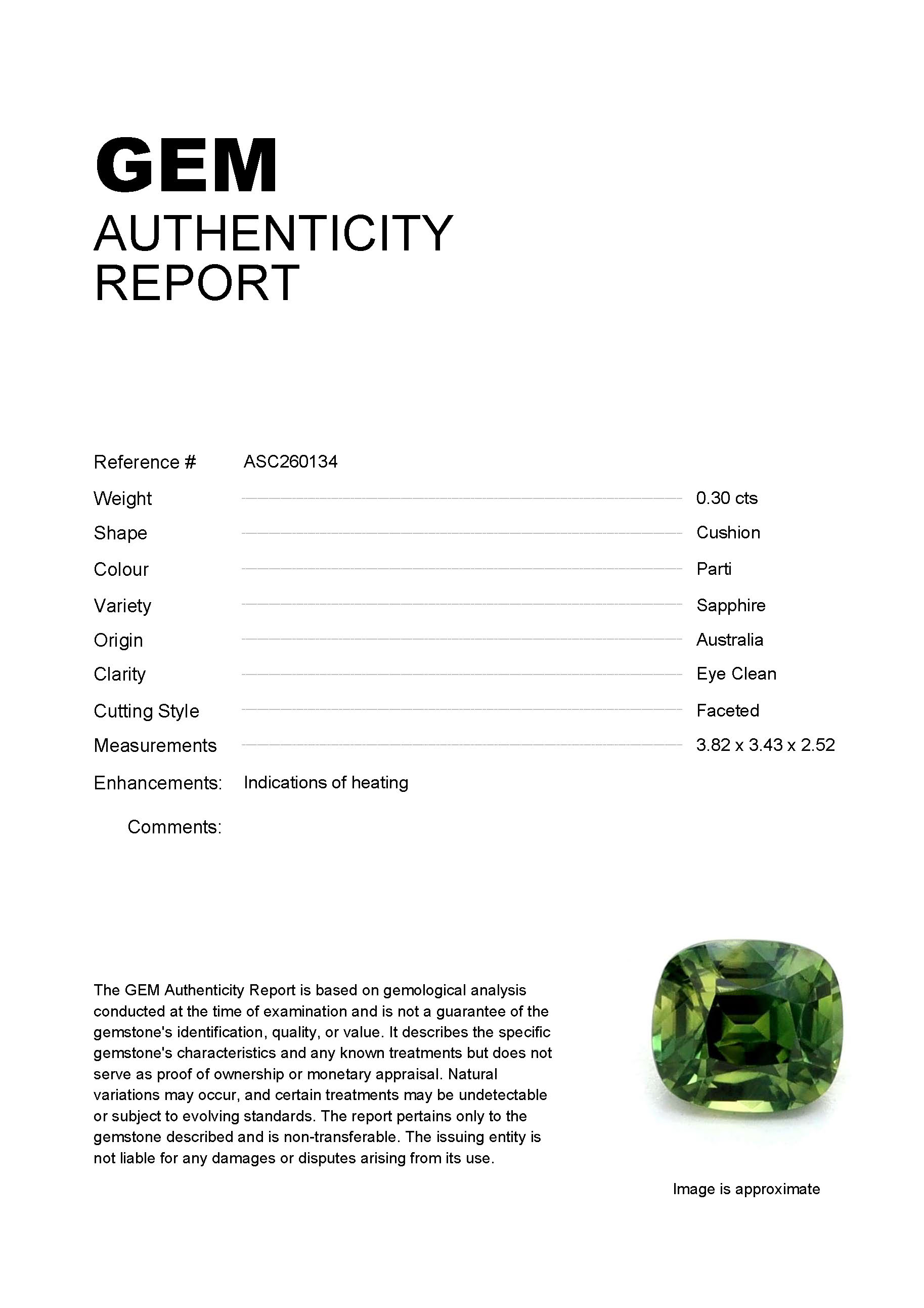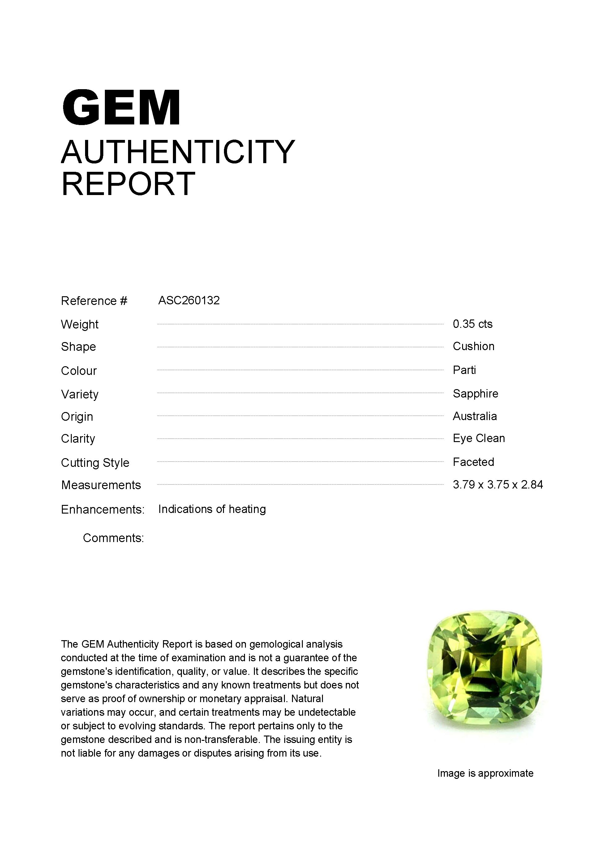 0.35ct Parti Cushion Australia SapphireCarat: 0.35 ctType: SapphireCut: CushionColour: PartiOrigin: AustraliaComment: Heated3.79 x 3.75 x 2.84 mm