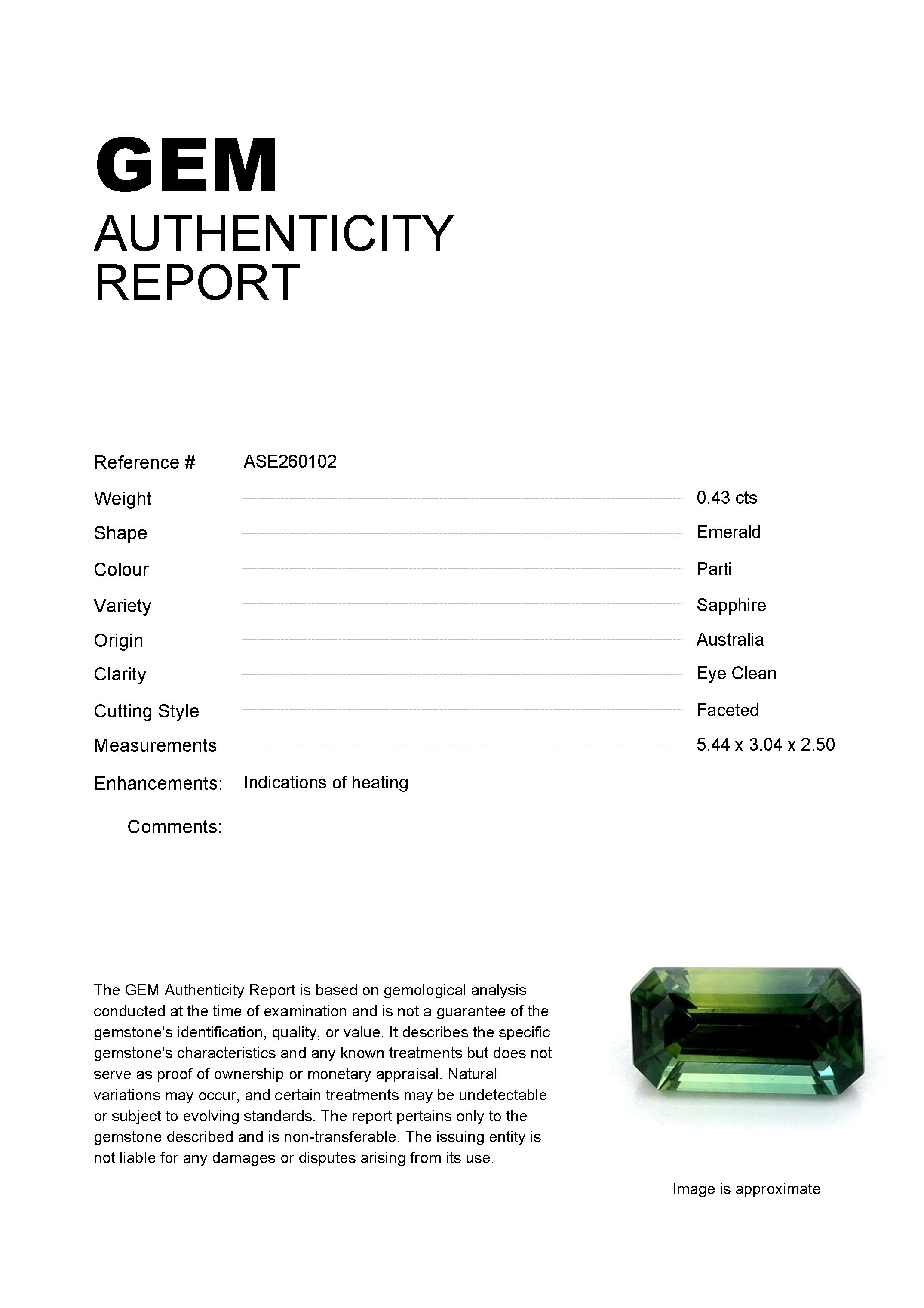 Stock ID: ASE2601030.42ct Parti Emerald Australia SapphireCarat: 0.42 ctType: SapphireCut: EmeraldColour: PartiOrigin: AustraliaComment: Heated5.54 x 3.26 x 2.18 mm