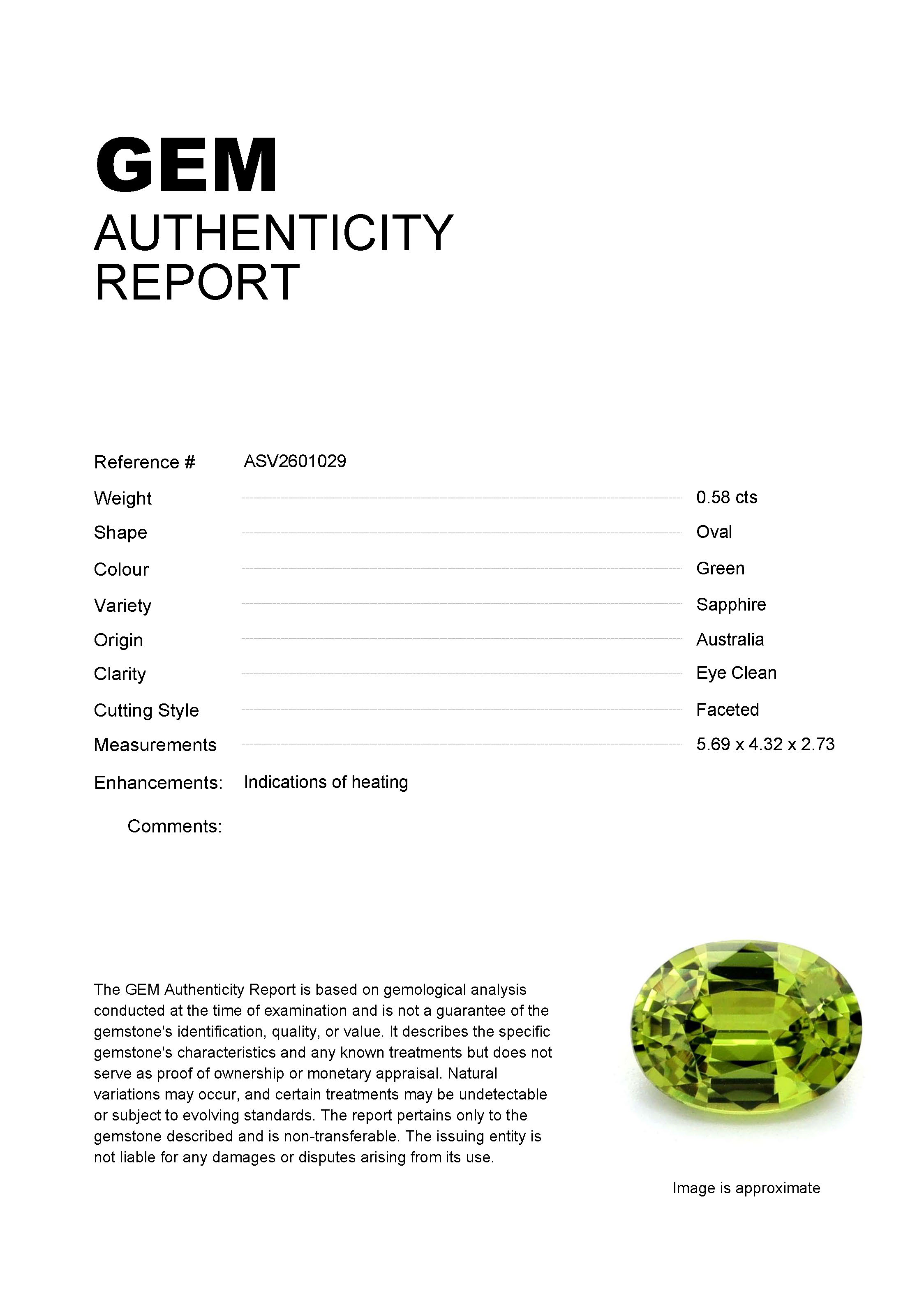 GEM: ASV2601029 Stock ID: ASV26010290.58ct Green Oval Australia SapphireCarat: 0.58 ctType: SapphireCut: OvalColour: GreenOrigin: AustraliaComment: Heated5.69 x 4.32 x 2.73 mm