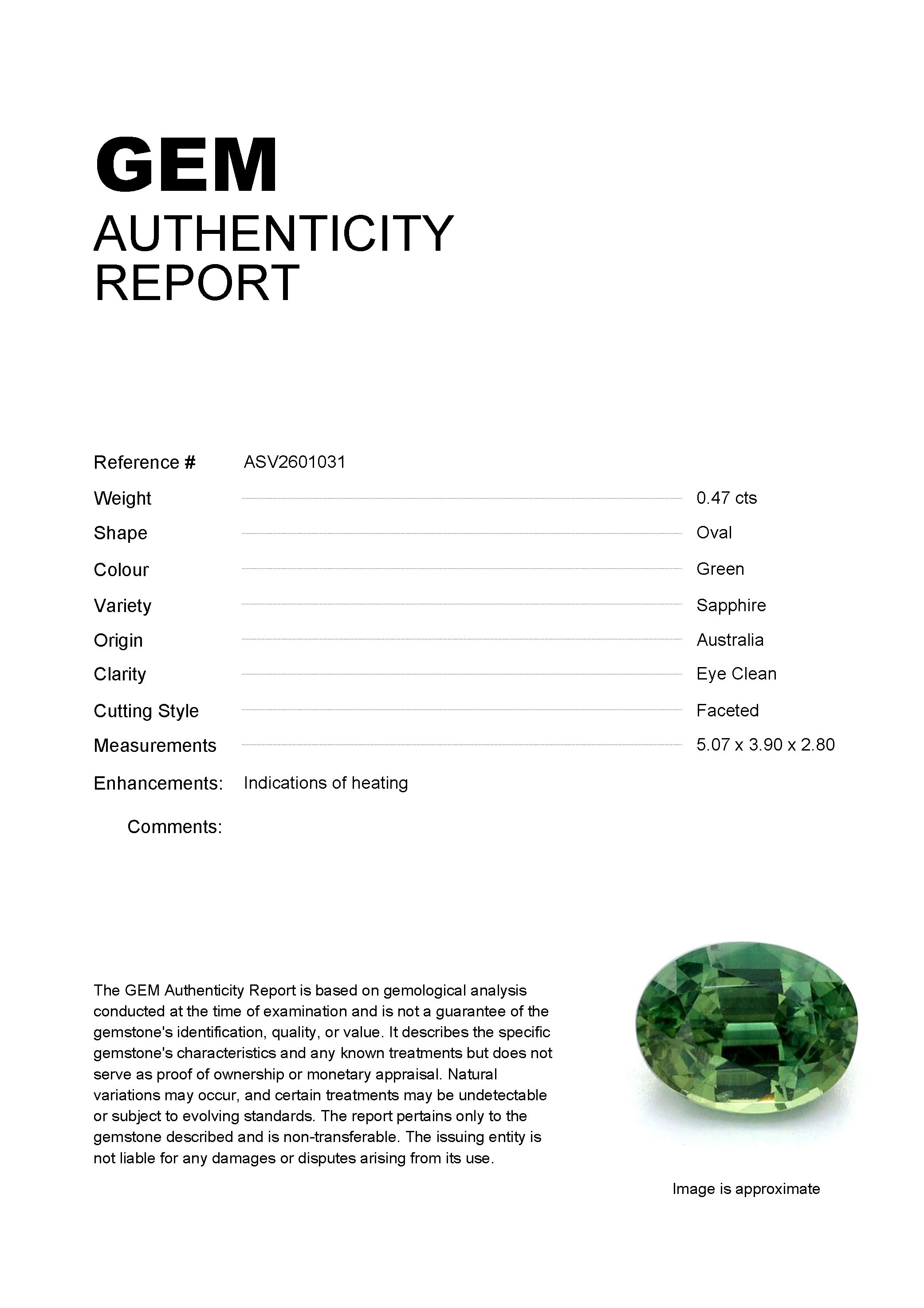 GEM: ASV2601031 Stock ID: ASV26010310.47ct Green Oval Australia SapphireCarat: 0.47 ctType: SapphireCut: OvalColour: GreenOrigin: AustraliaComment: Heated5.07 x 3.90 x 2.80 mm