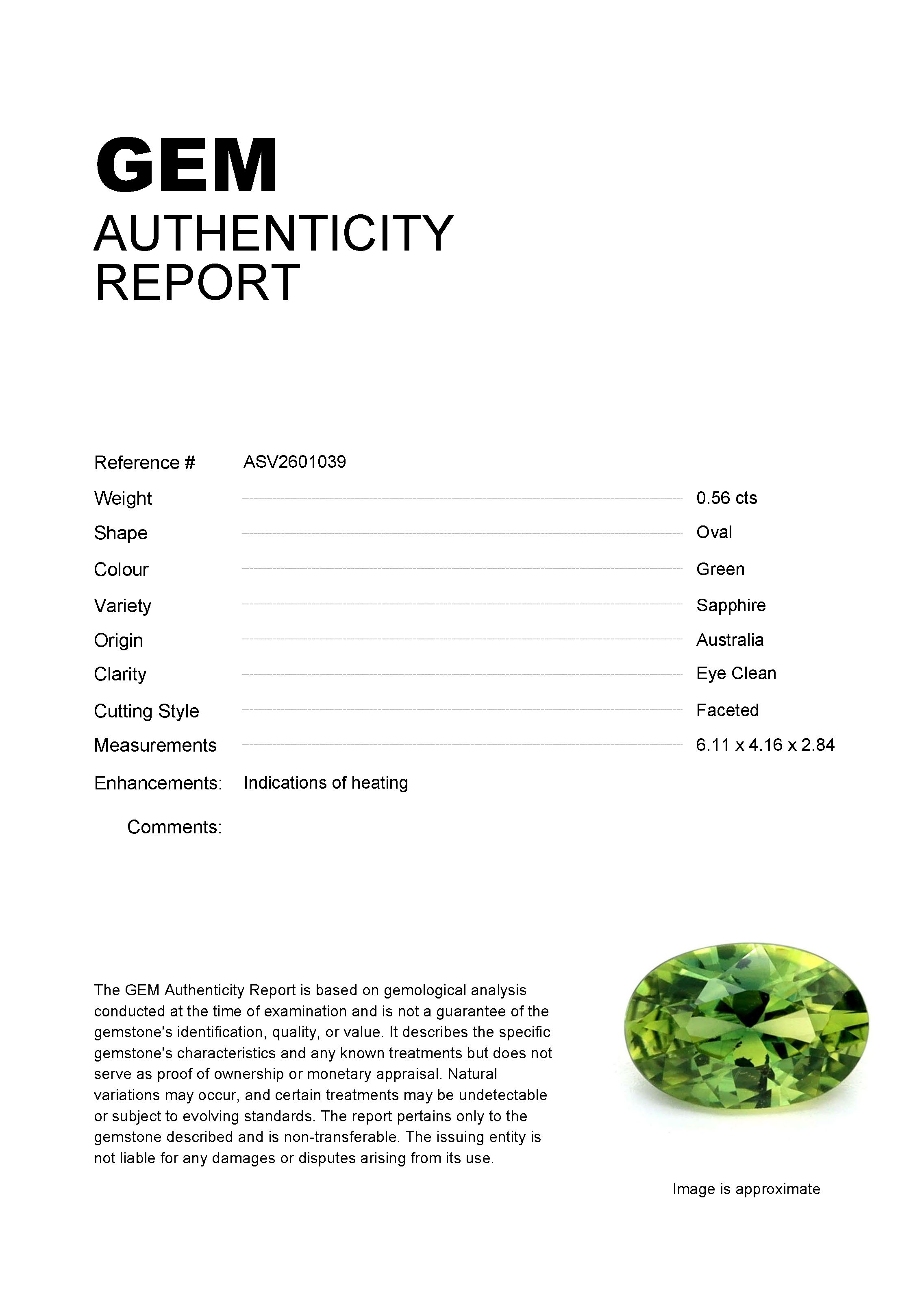 GEM: ASV2601039 Stock ID: ASV26010390.56ct Green Oval Australia SapphireCarat: 0.56 ctType: SapphireCut: OvalColour: GreenOrigin: AustraliaComment: Heated6.11 x 4.16 x 2.84 mm