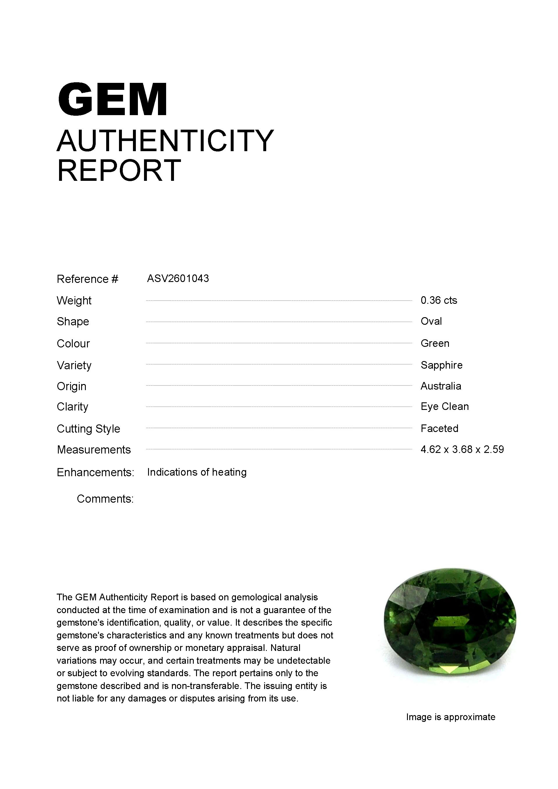 GEM: ASV2601043 Stock ID: ASV26010430.36ct Green Oval Australia SapphireCarat: 0.36 ctType: SapphireCut: OvalColour: GreenOrigin: AustraliaComment: Heated4.62 x 3.68 x 2.59 mm