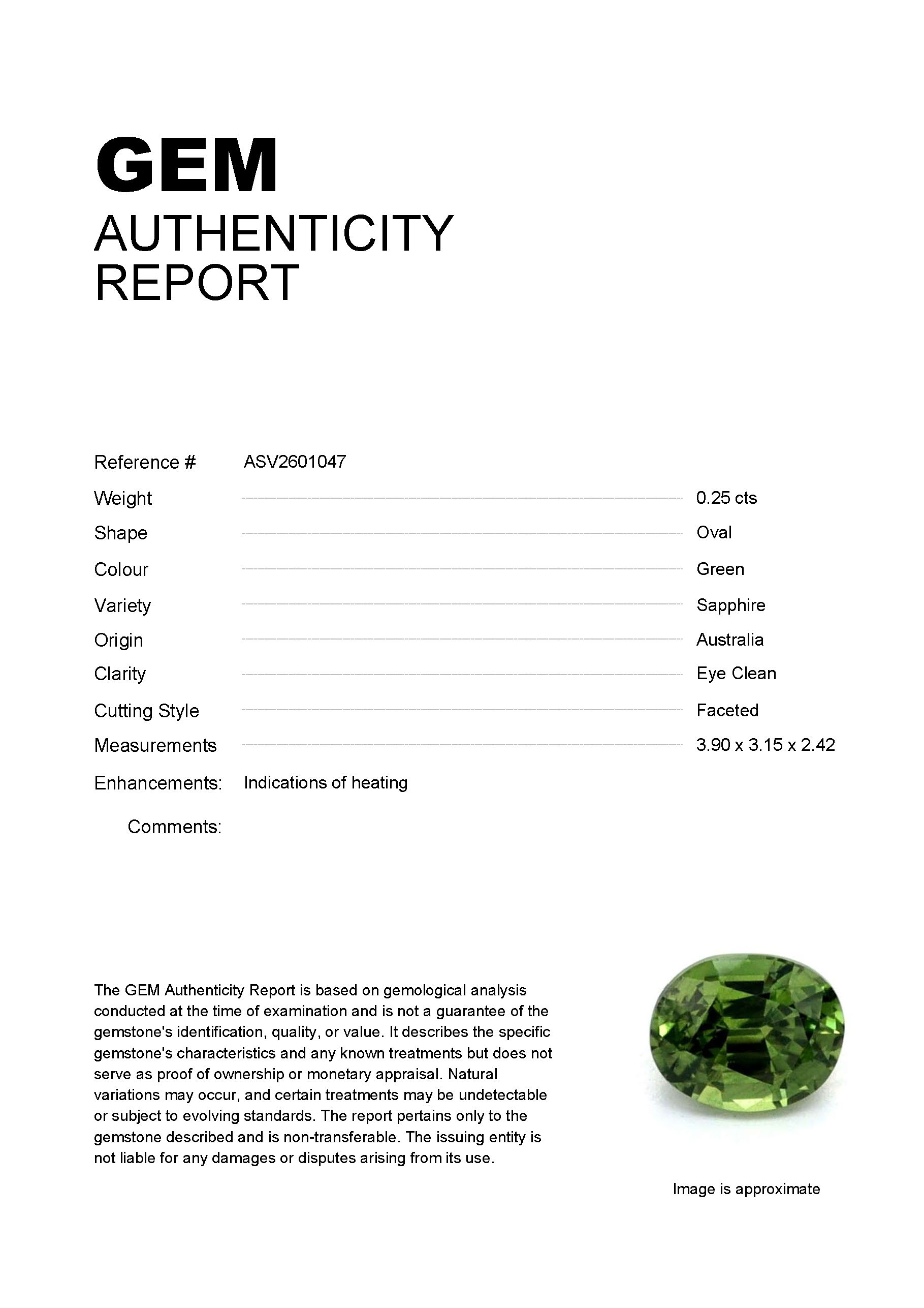 GEM: ASV2601046 Stock ID: ASV26010460.29ct Green Oval Australia SapphireCarat: 0.29 ctType: SapphireCut: OvalColour: GreenOrigin: AustraliaComment: Heated4.30 x 3.27 x 2.42 mm