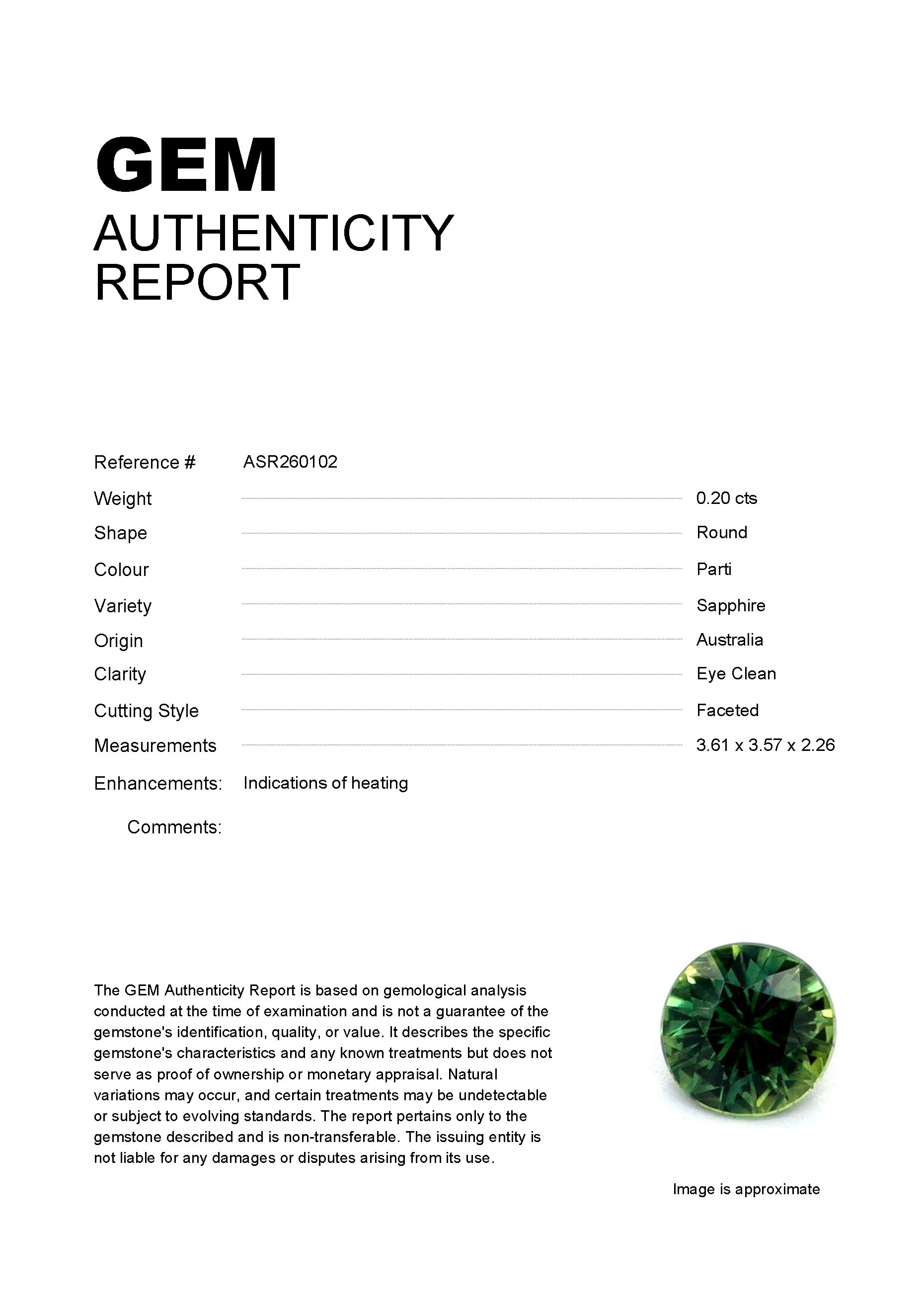 0.20ct Parti Round Australia SapphireCarat: 0.20 ctType: SapphireCut: RoundColour: PartiOrigin: AustraliaComment: Heated3.61 x 3.57 x 2.26 mm