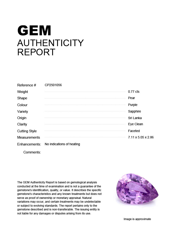 0.77ct Purple Pear Sri Lanka SapphireCarat: 0.77 ctType: SapphireCut: PearColour: PurpleOrigin: Sri LankaComment: Not Heated7.11 x 5.05 x 2.86 mm