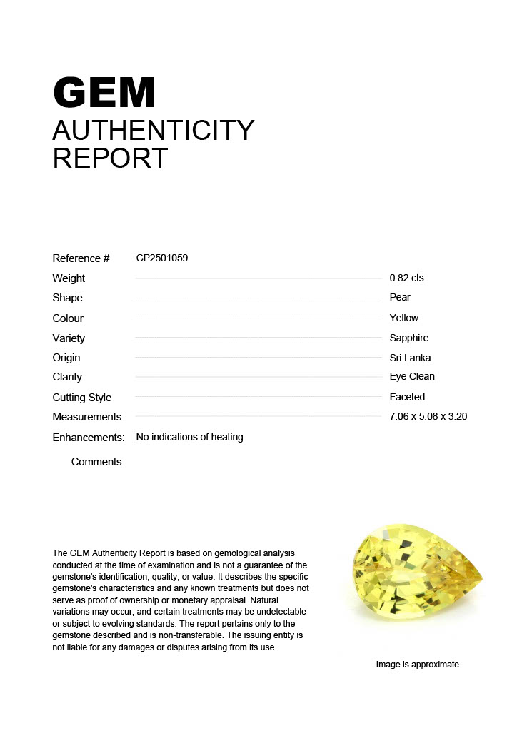0.82ct Yellow Pear Sri Lanka SapphireCarat: 0.82 ctType: SapphireCut: PearColour: YellowOrigin: Sri LankaComment: Not Heated7.06 x 5.08 x 3.20 mm