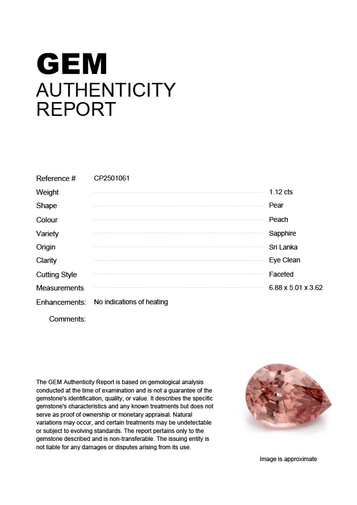 1.12ct Peach Pear Sri Lanka SapphireCarat: 1.12 ctType: SapphireCut: PearColour: PeachOrigin: Sri LankaComment: Not Heated6.88 x 5.01 x 3.62 mm